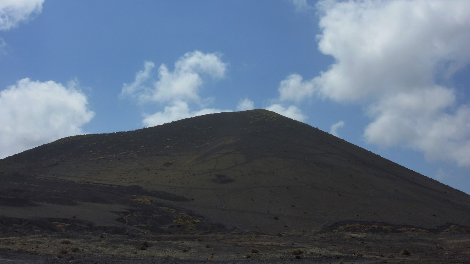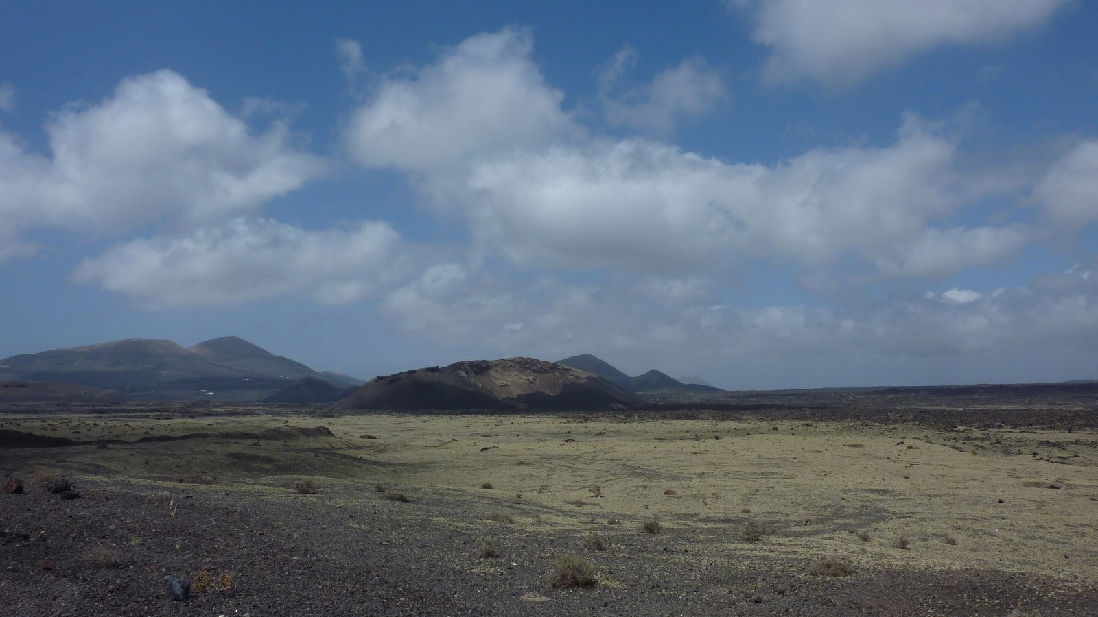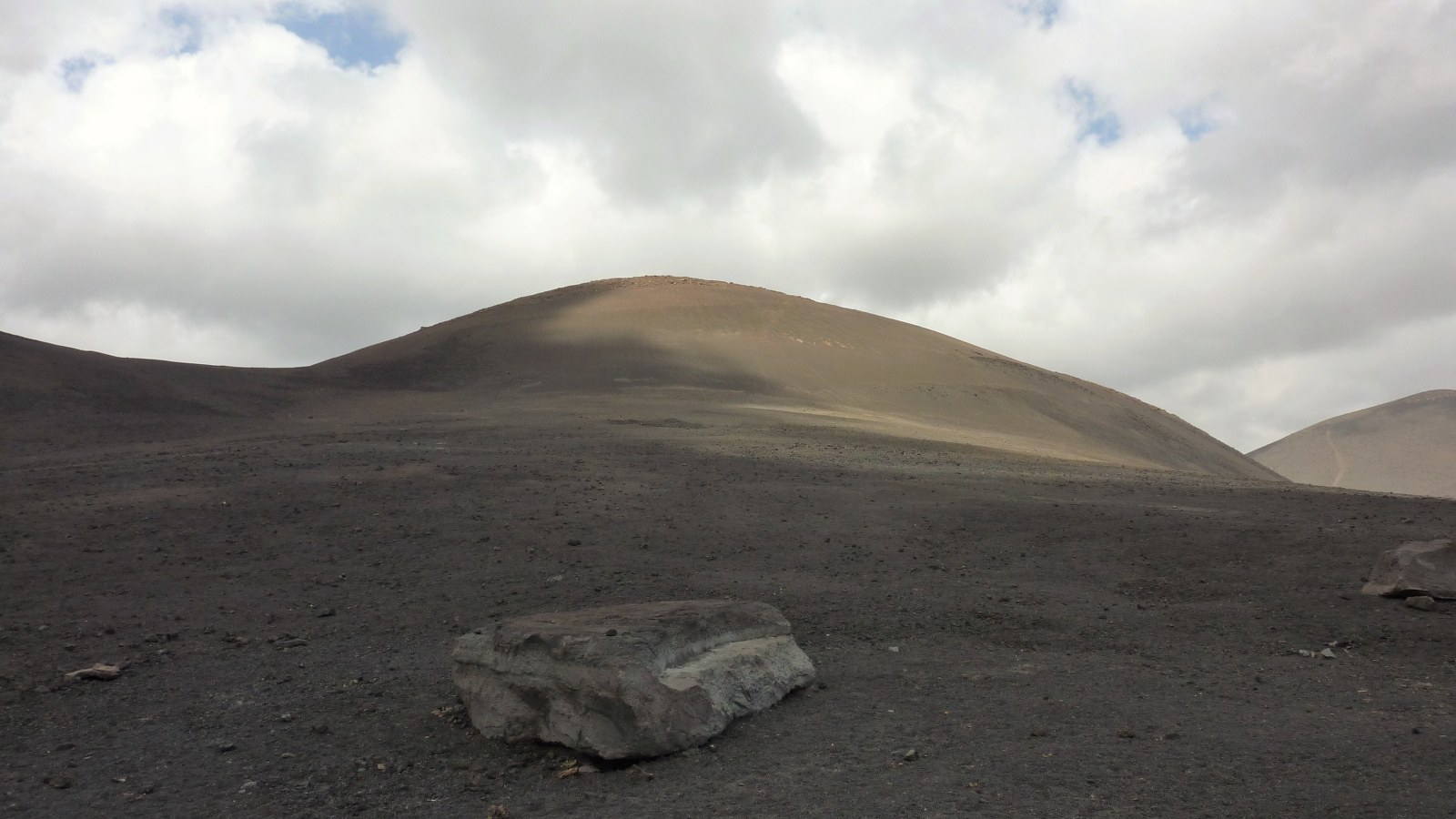 Zunächst gehen wir ein Stück parallel zur (02) LZ-56 (336 m). Wir befinden uns mittig zwischen der Montaña Negra (518 m) - der Vulkan links von uns - und der Caldera de Los Cuervos. Bei näherer Betrachtung könnte man denken, dass die Montaña Negra ebenfalls von 1730-1736 aktiv gewesen ist. Weit gefehlt - da der Vulkan in unmittelbarer Nähe der Vulkanausbrüche stand, wurde er nur von 3-5 m Vulkanasche begraben. Der Vulkan selber stammt aus der früheren Entstehungsgeschichte von Lanzarote.