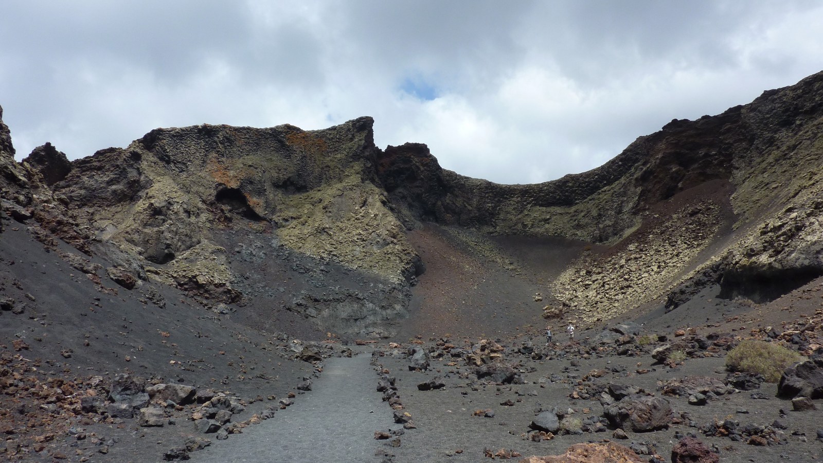 Wir erreichen (04) die Rückseite (317 m) des Vulkans. Selbst nach so langer Zeit vermittelt das Landschaftsbild den Eindruck, als ob der Vulkan erst vor kurzem erloschen ist. Aufgrund der sehr geringen Niederschläge auf Lanzarote schreitet der Erosionsprozess hier äußerst langsam voran.