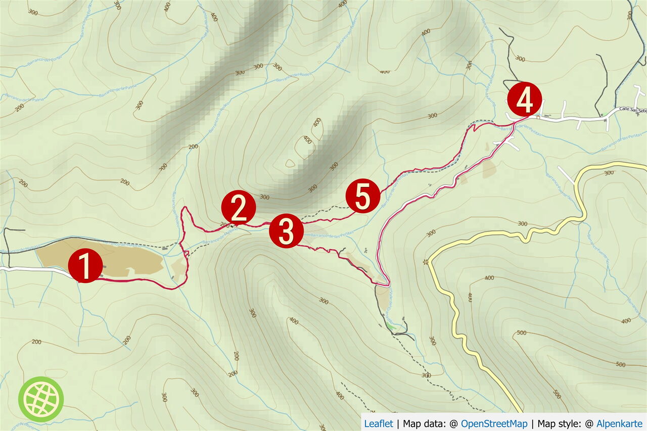 Ansonsten gehen wir auf dem klar erkennbaren Pfad am Südufer des Stausees entlang, bis zahlreiche Terrassenfelder erreicht sind. Heutzutage spielt die Landwirtschaft in Vega de Rio Palmas keine große Rolle mehr. Nur wenige Felder werden noch landwirtschaftlich genutzt. Etwas oberhalb führt der Weg an Ostgärten sowie Granatapfelbäumen vorbei, bis rechts eine Schotterstraße abzweigt. Auf der wenig befahrenen Straße gehen wir nach 70 m durch eine Linkskehre und erreichen nach 1,5 km das Restaurant und Museum (04) Casa de la Naturaleza (260 m).