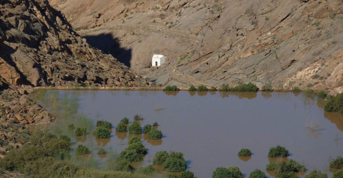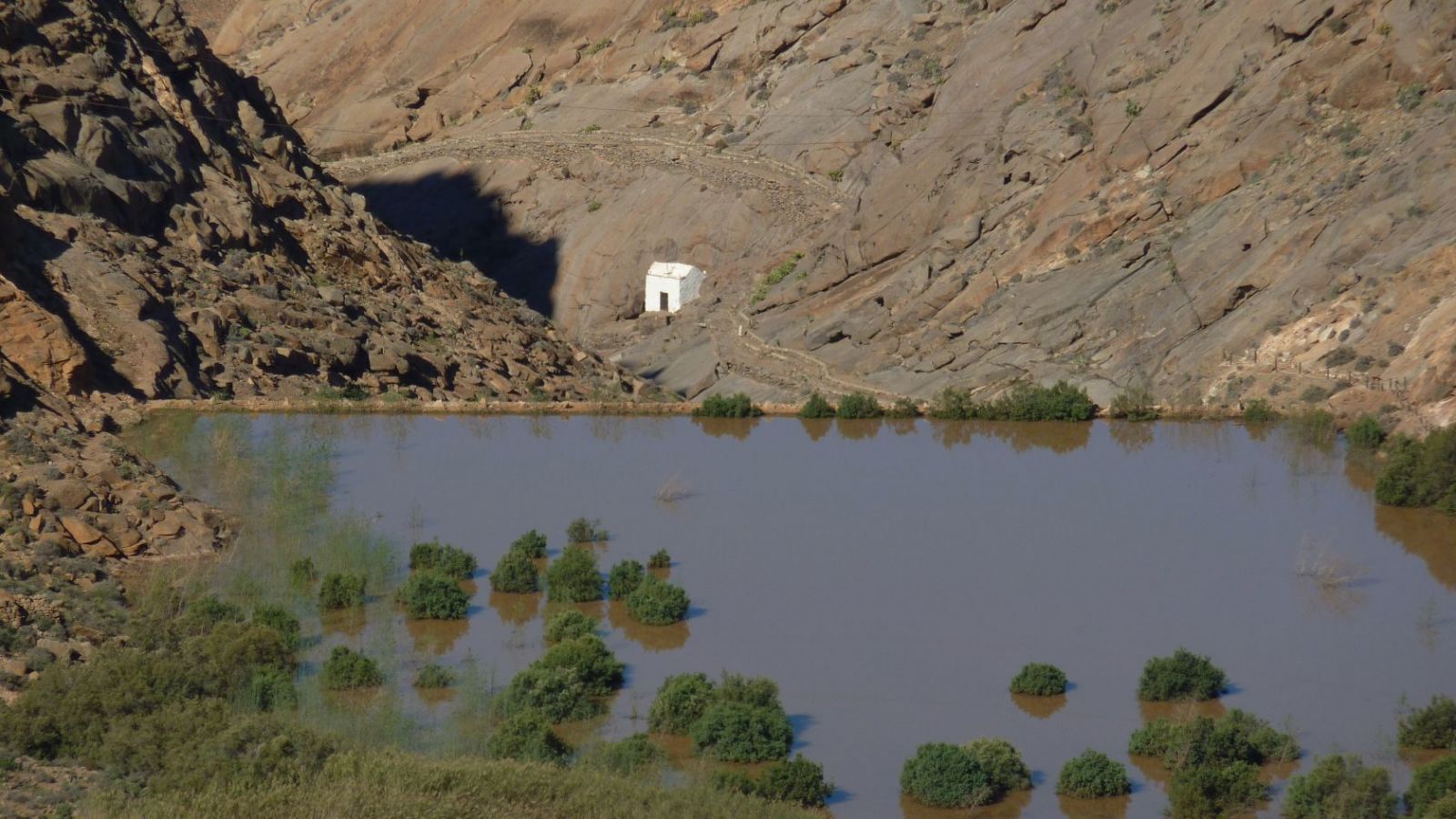Für den Rückweg gehen wir zunächst 100 m auf dem Hinweg zurück, um an der Weggabelung vor der Brücke rechts auf die beginnende Schotterstraße abzubiegen. Je nach Wasserstand des Barrancos kann man direkt durch dieses wandern oder es etwas erhöht umlaufen. Nach 200 m wechselt der Hauptweg auf die andere Uferseite und nach weiteren 300 m endet er gänzlich. Unweigerlich geht es nun im Barranco weiter. Schlussendlich wird der Bewuchs durch Tamarisken so eng, dass ein Weiterkommen nicht mehr möglich ist. 200 m nach einem Gebäude auf der rechten Seite beginnt oberhalb des Barrancos ein Pfad. Bei der nach 160 m folgenden Weggabelung halten wir uns halb links, in Richtung der Dammkrone des (05) Stausees (225 m). Von nun an geht es auf derselben Strecke wie auf dem Hinweg zurück.