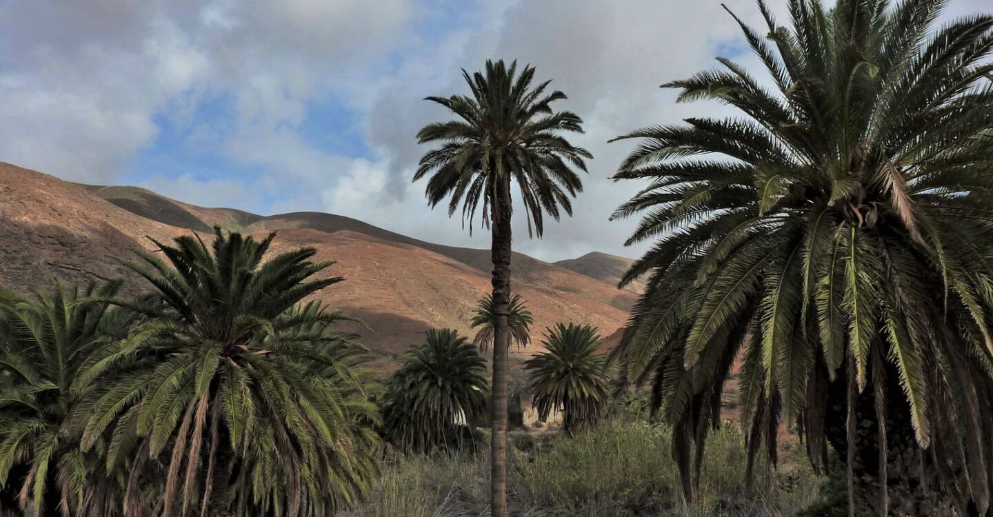 Vom (01) Start und Ziel (129 m) wandern wir in östliche Richtung auf das große Felsmassiv zu. In der Ferne sehen wir eine bizarre Felsschlucht, durch die unser weiterer Weg führt. Aufgrund der Höhenlage gibt es in der Region um Vega de Rio Palmas weitaus mehr Regen als in anderen Regionen Fuerteventuras. So können unter anderem Getreide, Kartoffeln und Hülsenfrüchte angebaut werden. Der Weg führt vorbei an Ruinen und zahlreichen Kanarischen Dattelpalmen. Es geht über eine kleine Brücke und dann in nördliche Richtung, bis wir das Barranco de las PeNitas erreichen. Den halbrechten Abzweiger ignorieren wir, steigen in das Barranco herunter und queren es. Nach weiteren 50 m geht es auf dem klar erkennbaren Pfad in nördliche Richtung. In einer großen Rechtskurve gewinnen wir schnell an Höhe, bis der Weg direkt durch die spektakuläre Felsschlucht verläuft.