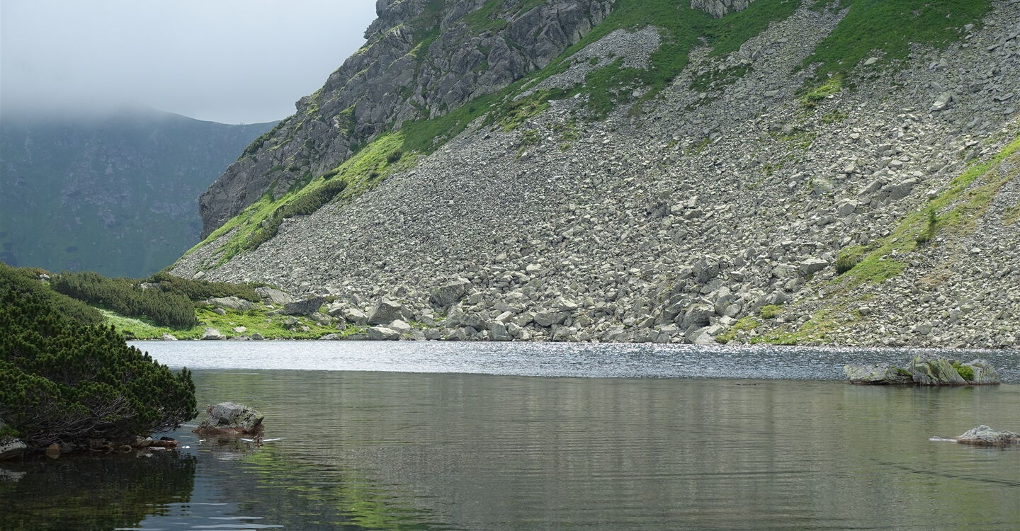 Den darauffolgenden rechten Abzweiger lassen wir aus und gehen geradeaus weiter. Wir erreichen die idyllisch am Ťatliakova-See gelegene 02 Ťatliakova Chata (1316 m). Sie ist in der Zeit vom 15. Juni bis 30. Oktober bewirtschaftet. Ein geräumiges Esszimmer mit Kamin lädt zum Verweilen ein. Noch vor der Hütte zweigt halb links der ausgezeichnete Pfad Richtung Roháče plesá ab. Dieser führt etwas oberhalb des ersten Sees entlang. Links oberhalb (Richtung Osten) auf dem Bergrücken befindet sich die Tour 75 – im Grenzgebiet zwischen der Slowakei und Polen.