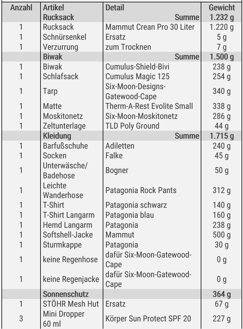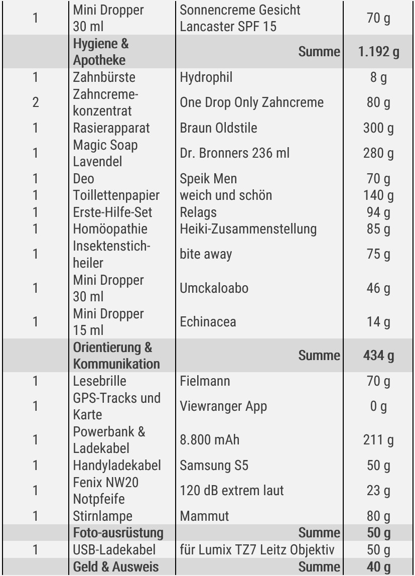 Ein Patentrezept für die optimale Packliste gibt es nicht, jeder Wanderer und jede Wanderin hat seine ganz eigenen und persönlichen Präferenzen. Mein Ziel waren 10 Kilo Gesamtgewicht. Das beinhaltet schon 3 l Trinkwasser und 10 Powerriegel mit insgesamt ca. 2000 kcal (Notreserve). Also ca. 6,5 Kilo Gewicht ohne Proviant und Trinkwasser. Sportlich, aber realistisch!