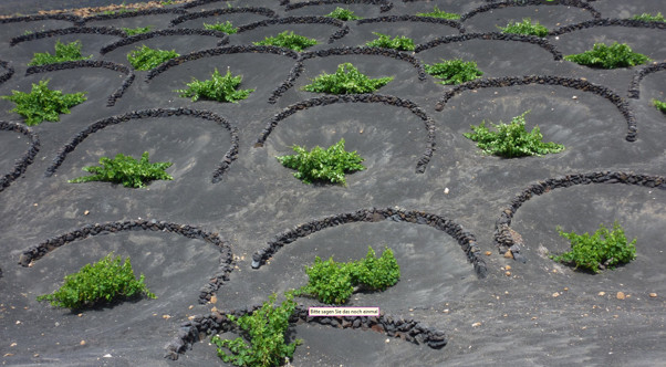 Bei der neuen Anbaumethode wurden bis zu 3 m tiefe Mulden gegraben, um den darunterliegenden fruchtbaren Boden zu erreichen und gleichzeitig die Rebstöcke vor dem Wind zu schützen. Man pflanzte den Rebstock in eine etwa 20 cm dicke Schicht aus picón (vulkanisches Lapilli = Vulkanasche). Die Vulkanasche hat die Eigenschaft, Wasser zu speichern, wodurch ständig Feuchtigkeit gespendet werden kann und die Austrocknung der Pflanzen reduziert wird. So erzielt man bei den sehr geringen Niederschlagsmengen regelmäßig gute Ernten. Es entstand das einzigartige Landschaftsschutzgebiet La Geria. Das Gehöft La Geria überlebte die Katastrophe und wurde im Laufe von 3 Jahrhunderten mehrfach saniert, bis daraus die heutigen Bodegas Rubicón wurden. Mit einer stimmigen Harmonie aus Tradition und Innovation wurde das alte Gut restauriert. Dabei wurden ursprüngliche Materialien mit modernster Technologie zur Weinerzeugung kombiniert. Darüber hinaus entstand ein sehr sehenswertes Museum. Die Weine der Sorten Malvasier und Muskateller brauchen keinen Vergleich mit großen Weingütern in Frankreich oder Italien scheuen.