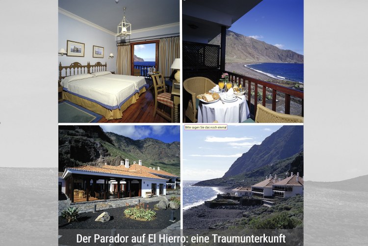 Der Parador El Hierro ist die luxuriöseste Unterkunft von El Hierro und befindet sich direkt am Meer und am Fuße von bis zu 1.000 m hohen Bergen. Das abgelegene Hotel verfügt über eine wunderschöne Aussicht auf den Atlantischen Ozean, der Blick in den Sonnenaufgang ist einfach fantastisch. Das klimatisierte Hotel bietet 45 Doppelzimmer, die elegant im Stil der Kolonialzeit eingerichtet sind, WiFi in den öffentlichen Bereichen und eine Rezeption, die 24 Stunden geöffnet ist. Ein perfekter Ort zum Entspannen! | Las Playas 15, 38910 Villa de Valverde | +34922558036 | Webseite | GPS-Pkw 27.717220 -17.958623 | GPS-Koordinaten 27.717232 -17.958626 | siehe Wanderungen 13* und 31* |