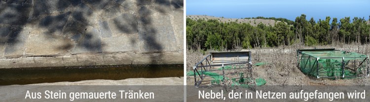 Noch vor 30 Jahren war die Wassergewinnung die größte Herausforderung auf El Hierro. Die im Wanderführer beschriebene Rundwanderung 41 führt in umgekehrter Richtung zum verkürzten Originalweg an unzähligen Wasserstellen, Wasserreservoirs und weiteren Wasserauffangmethoden vorbei. So baute man beispielsweise Nebelnetze gegen die Wasserknappheit, denn der durchschnittliche jährliche Niederschlag auf El Hierro beträgt gerade einmal 181 mm. Durch die hohe Luftfeuchtigkeit der vorbeiziehenden Passatwolken entsteht jedoch starker Nebel, der in Netzen aufgefangen und nutzbar aufbereitet wird. Je nach Größe des Netzes lassen sich mit dieser Methode mehrere Liter Wasser sammeln. Außerdem wurden unterhalb der Bäume im Einflussbereich der Passatwolken aus Stein gemauerte Tränken erbaut, die das heruntertropfende Nass auffangen. | GPS-Koordinaten 27.789977 -17.943147 | siehe Wanderung 41* |