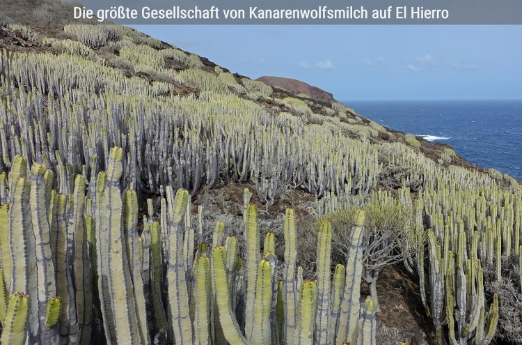 Aufgrund der seltenen Niederschläge, verbunden mit einer extrem hohen Sonneneinstrahlung, findet man in den küstennahen Regionen von El Hierro eine karge Vegetationsdecke ohne dichten Baumbestand. Aber dafür gibt es zahlreiche endemische Pflanzen. Die Kanarenwolfsmilch aus der Familie der Wolfsmilchgewächse ist ein solches Beispiel und kommt auf allen Kanarischen Inseln vor. In der Sukkulentenbuschzone wächst sie in Höhenlagen zwischen 50 und ca. 1.000 m und bildet dort häufig größere Bestände. Die größte Gesellschaft dieser Pflanze auf El Hierro befindet sich im Nordosten der Insel und ist nur zu Fuß erreichbar. Die Kanarenwolfsmilch, deren Milchsaft stark giftig ist, kann bis zu 3 m in die Höhe wachsen und auch mehrere Meter in die Breite. Dabei kann jede Pflanze bis zu 100 dicke und blattlose Triebe entwickeln. Durch diese Triebe können Euphorbien relativ lange trockene Zeiten überdauern. | GPS-Koordinaten 27.840050 -17.907170 | siehe Wanderung 50* |