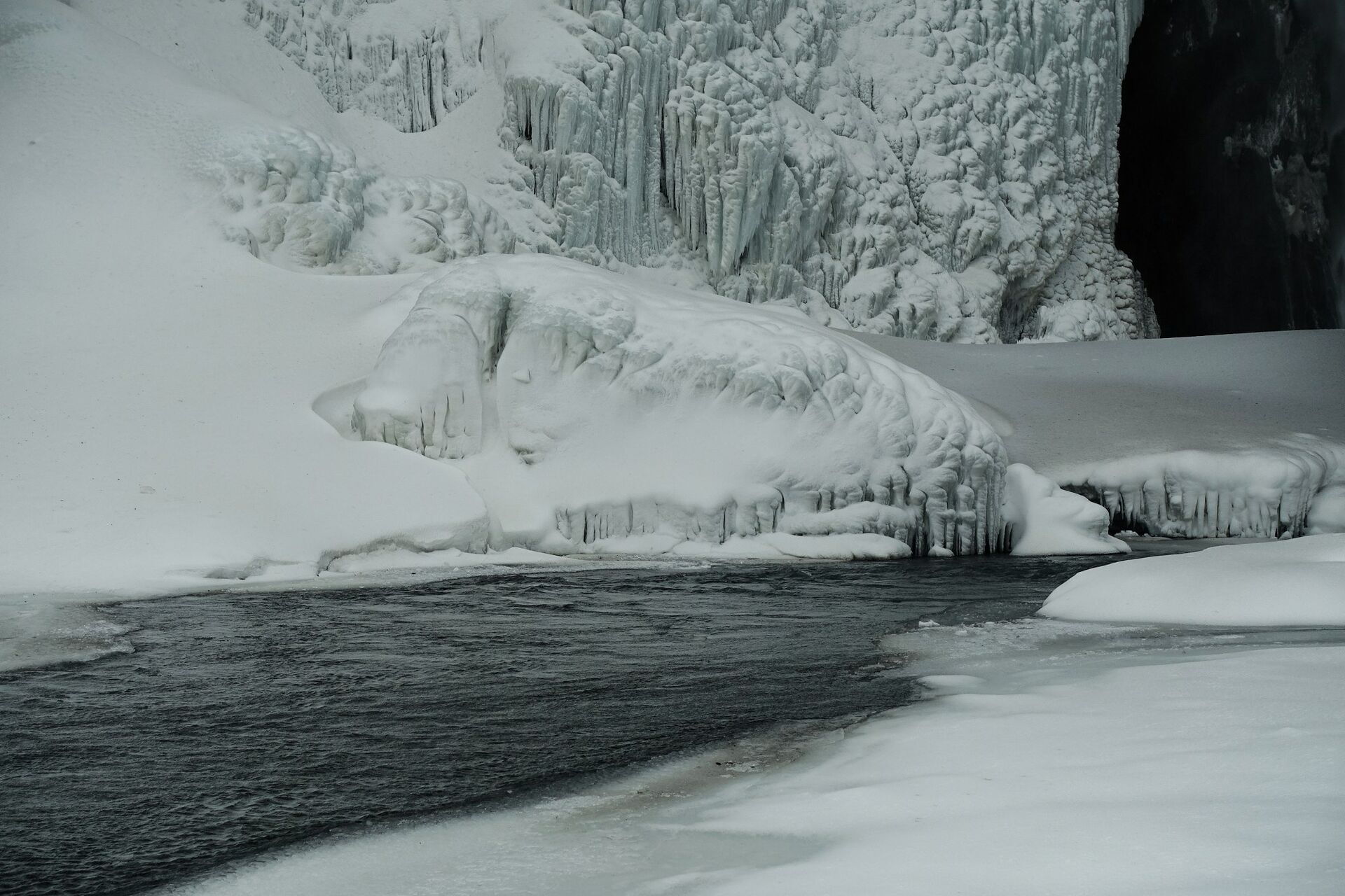 Island – Am Hjálparfoss macht die Fossá bei einem Schneesturm ihrem Namen alle Ehre.
