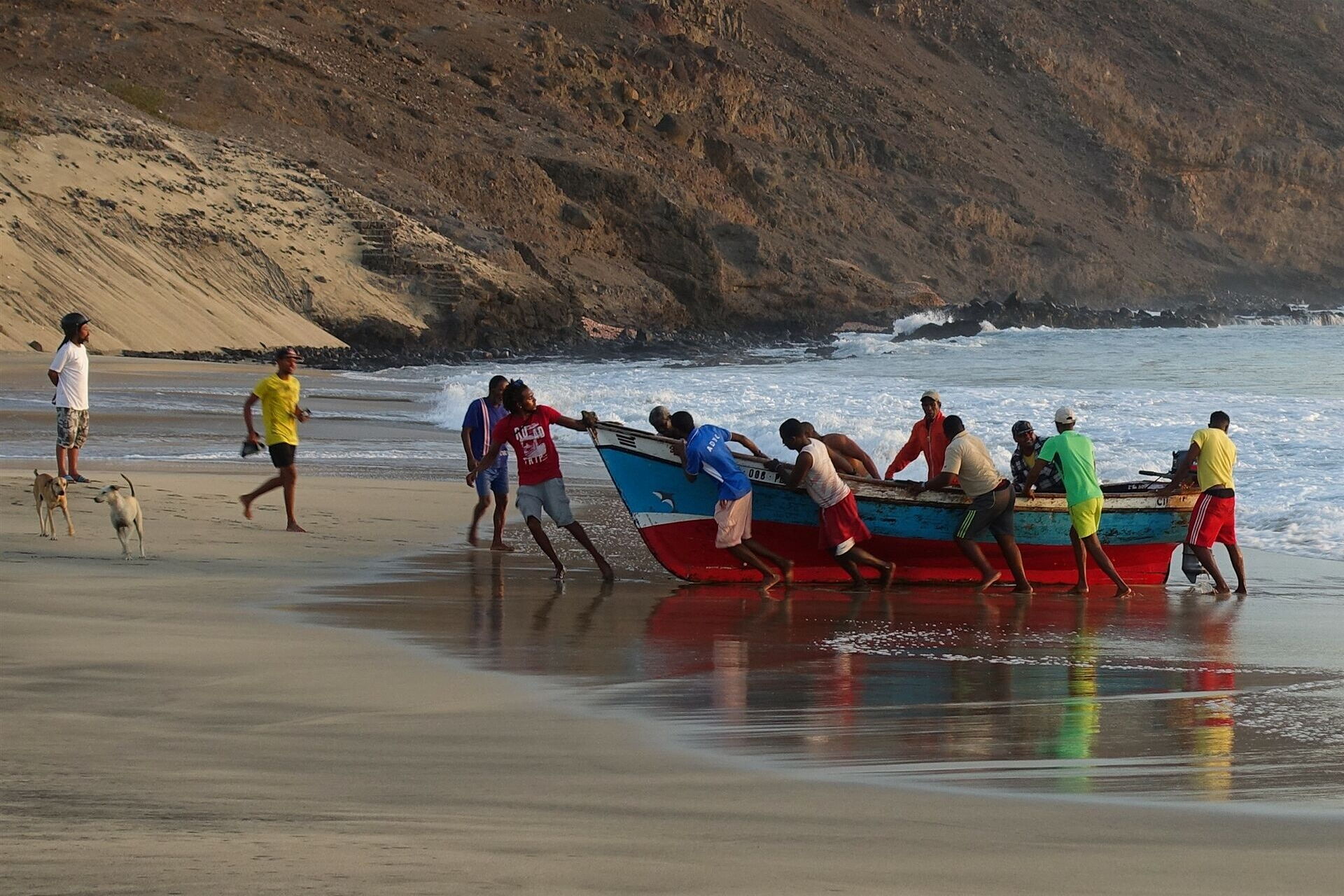 Kapverden - Insel São Vicente - Fischer ziehen ihr Boot an den Strand von São Pedro