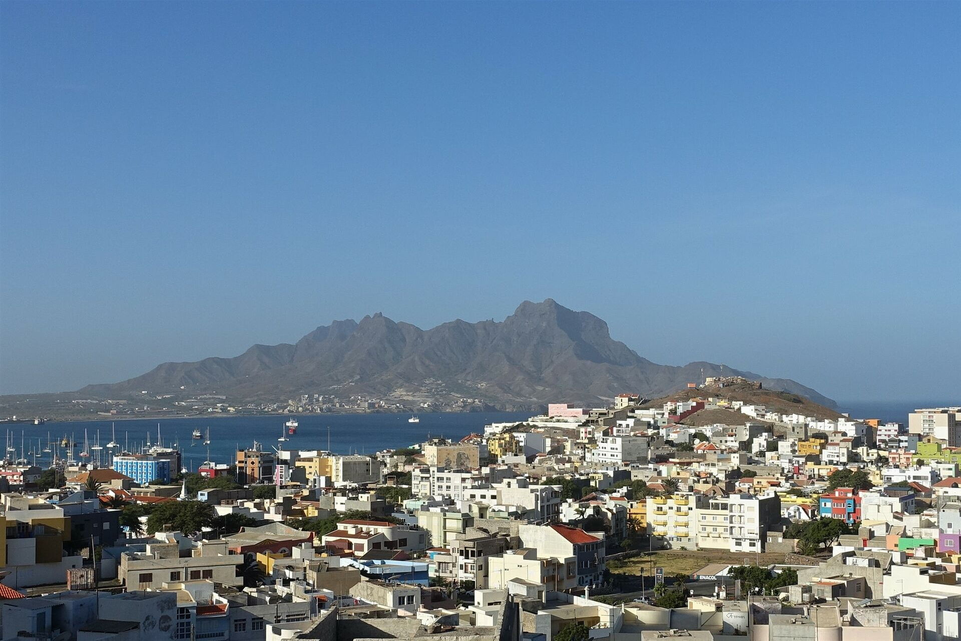 Kapverden - Insel São Vicente - der omnipräsente Monte Verde vom Hafen aus gesehen