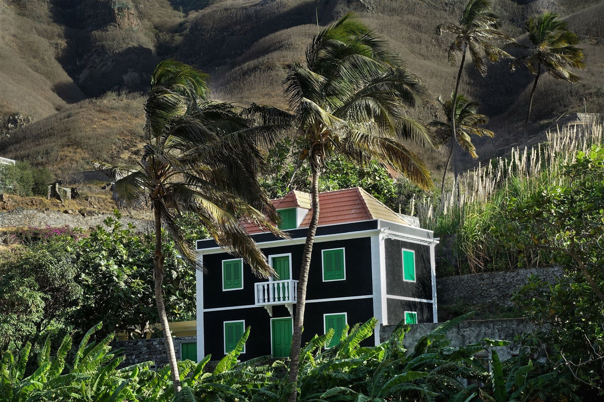 Kapverden - Insel Santo Antão - im Kolonialstil erbautes Haus unter Palmen