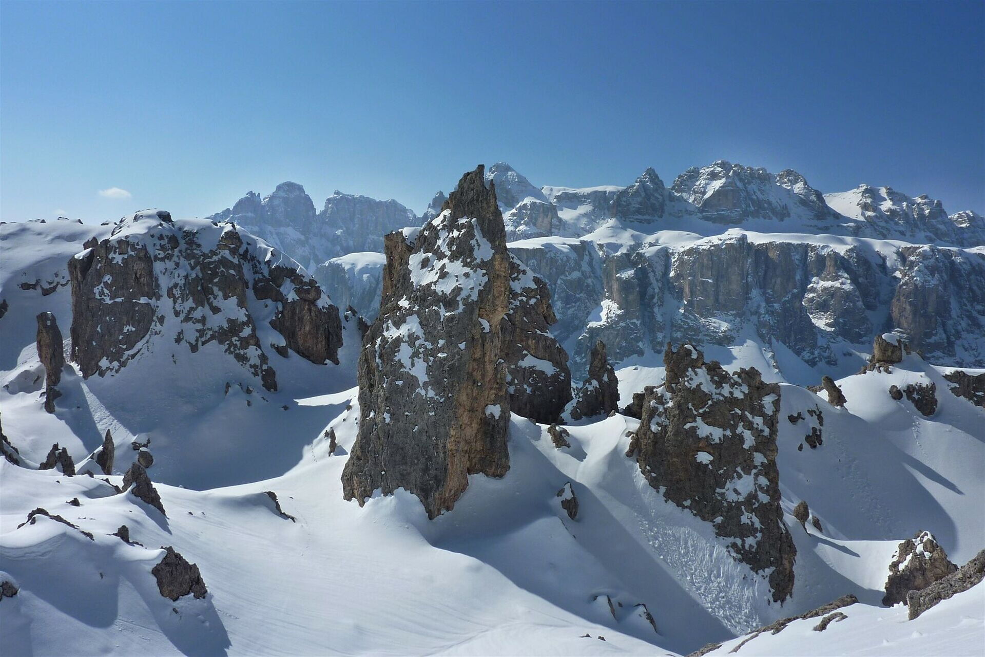Variantenabfahrten - die Cirspitzen mit dem dahinterliegenden Sellastock