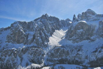 Genussabfahrt zwischen dem Sellamassiv und dem Platt- und Langkofel bei genügend Schnee.