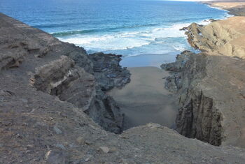 Extrem schwieriger Abstieg in eine einsame Bucht ohne Bademöglichkeit, die man schon von Ajuy sehen kann.