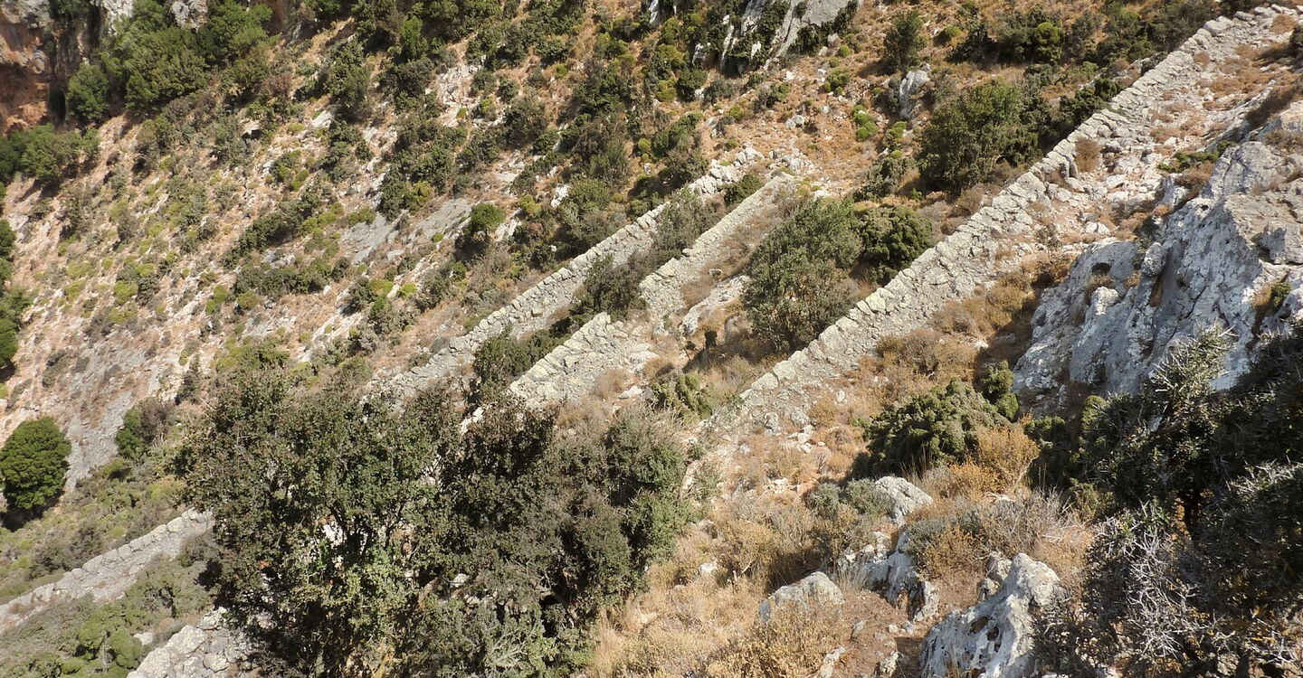 Hinter einer kleinen Schlucht erreichen wir eine Weggabelung, gehen geradeaus weiter und lassen das Haus rechts von uns liegen. Die Piste geht in einem Pfad über, wir passieren ein Ziegengatter und steigen bergauf, bis wir wieder auf eine Schotterpiste gelangen. Nach 250 m, in einer Linkskehre der Piste, verlassen wir diese nach rechts und gehen fortan auf dem äußerst beeindruckenden 03 Minoan Path (928 m). Dieser schraubt sich, ohne Ablass, in langen Kehren Richtung Tal – und das tut er schon seit mindestens 3000 Jahren! Bei guter Sicht kann man die vorgelagerte Insel Dia, einen Stausee und die komplette Tiefebene an der nördlichen Küste von Kreta ausmachen.