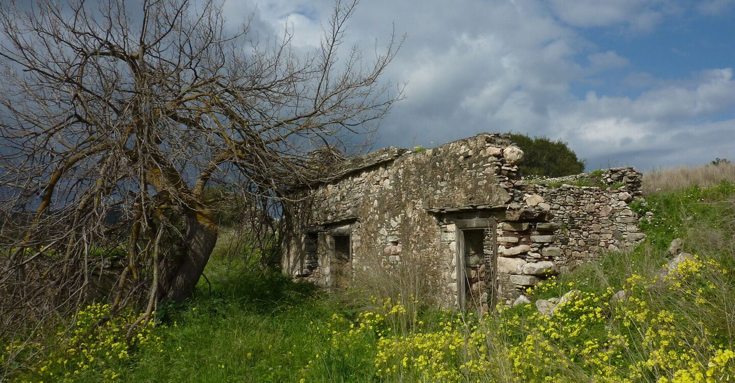 An diesem Wegpunkt 5 gehen wir geradeaus, kommen an der Kapelle Agios Nanous Panormitis vorbei, gehen bei der folgenden Weggabelung halb links und erreichen nach 320 m die (02) Ruinen von Nani (191 m). Wir treffen auf 6 gespenstische Ruinen oberhalb eines sehr fruchtbaren Hochtals. Uralte Olivenbäume und riesige Feigenbäume stehen in unmittelbarer Nähe.