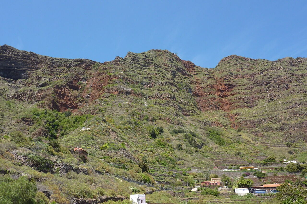 Mit Blick Richtung Teneriffa befindet sich am äußersten rechten Ende des Parkplatzes der (05) Abstieg durch die Rote Wand (485 m) nach Agulo. An der Weggabelung unterhalb des Staudammes halten wir uns links. Bei einem Holzgeländer stehen wir bereits mitten in der Wand und der steile Abstieg bis zur GM-1 kann beginnen. Diese überqueren wir anschließend und gehen auf dem weiterführenden Pfad bis zu einer gepflasterten Straße. Diese überqueren wir nach rechts, um an einem Geländer und Plantagen abermals auf die GM-1 zu gelangen und dort weiter geradeaus zum Parkplatz vorzugehen.