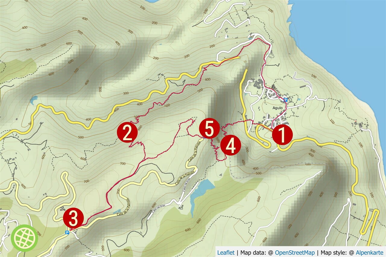 Vom Parkplatz in (01) Agulo (191 m) gehen wir auf der GM-1 Richtung Vallehermoso, um bei der nächsten Möglichkeit nach 40 m rechts in die Einbahnstraße zu biegen und bei der folgenden Weggabelung links zu gehen - wir lassen die Bar Mantillo rechts von uns liegen. Beim Hotel Rural Casa Lugo endet die Straße und wir gehen rechts weiter. Bei der anschließenden Weggabelung geht es links weiter - nicht rechts in die Sackgasse. Wir überqueren den Platz Leoncio Bento mit der Kirche und dem Rathaus und lassen nach 250 m den Abzweiger links liegen.