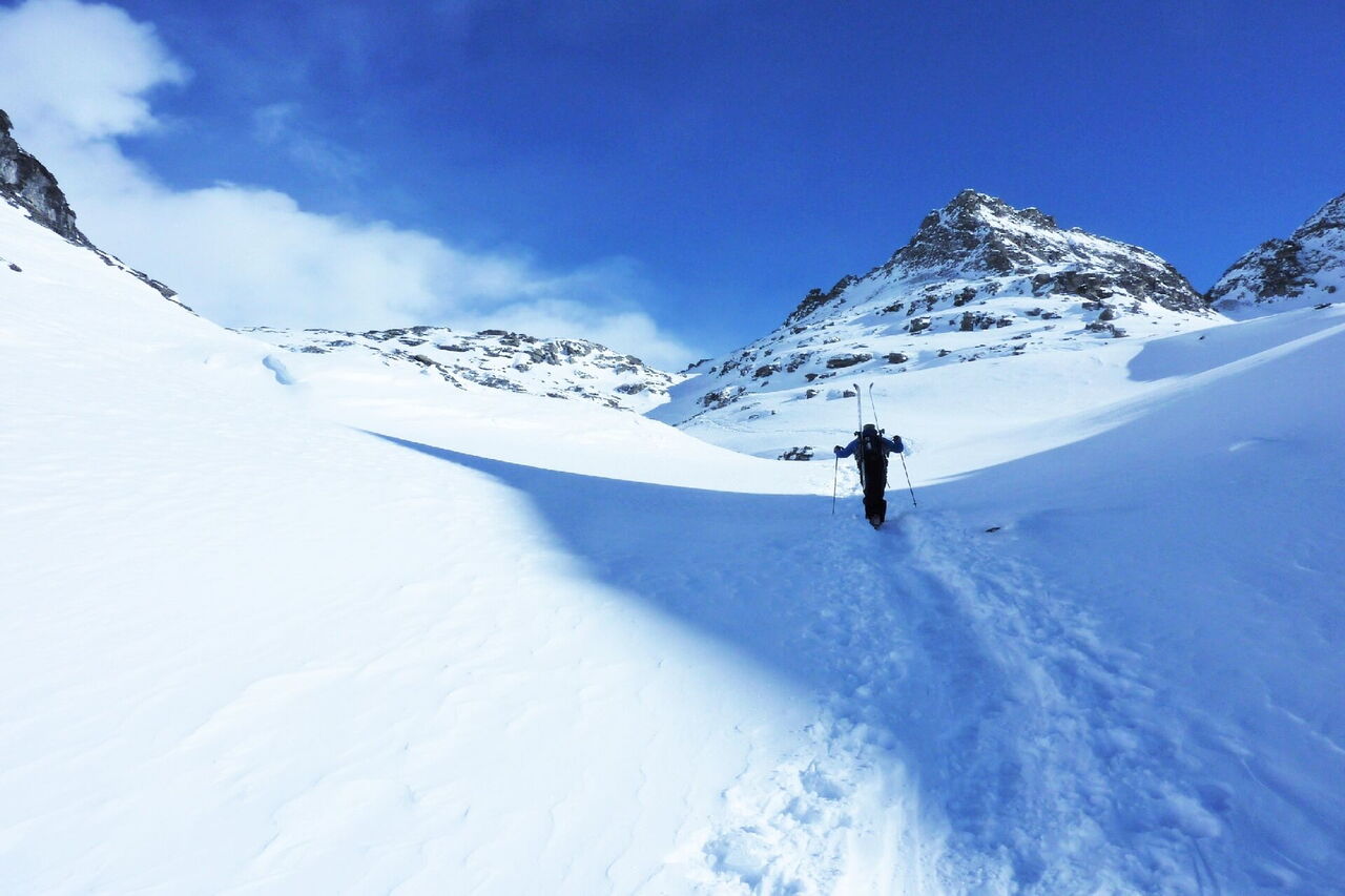 Wenn der Weg bereits gespurt ist, können wir die Ski schultern; sonst ist Auffellen angesagt. Nach dem Passo Zube halten wir uns rechts, auf die Ausläufer vom Punta di Straling zu.