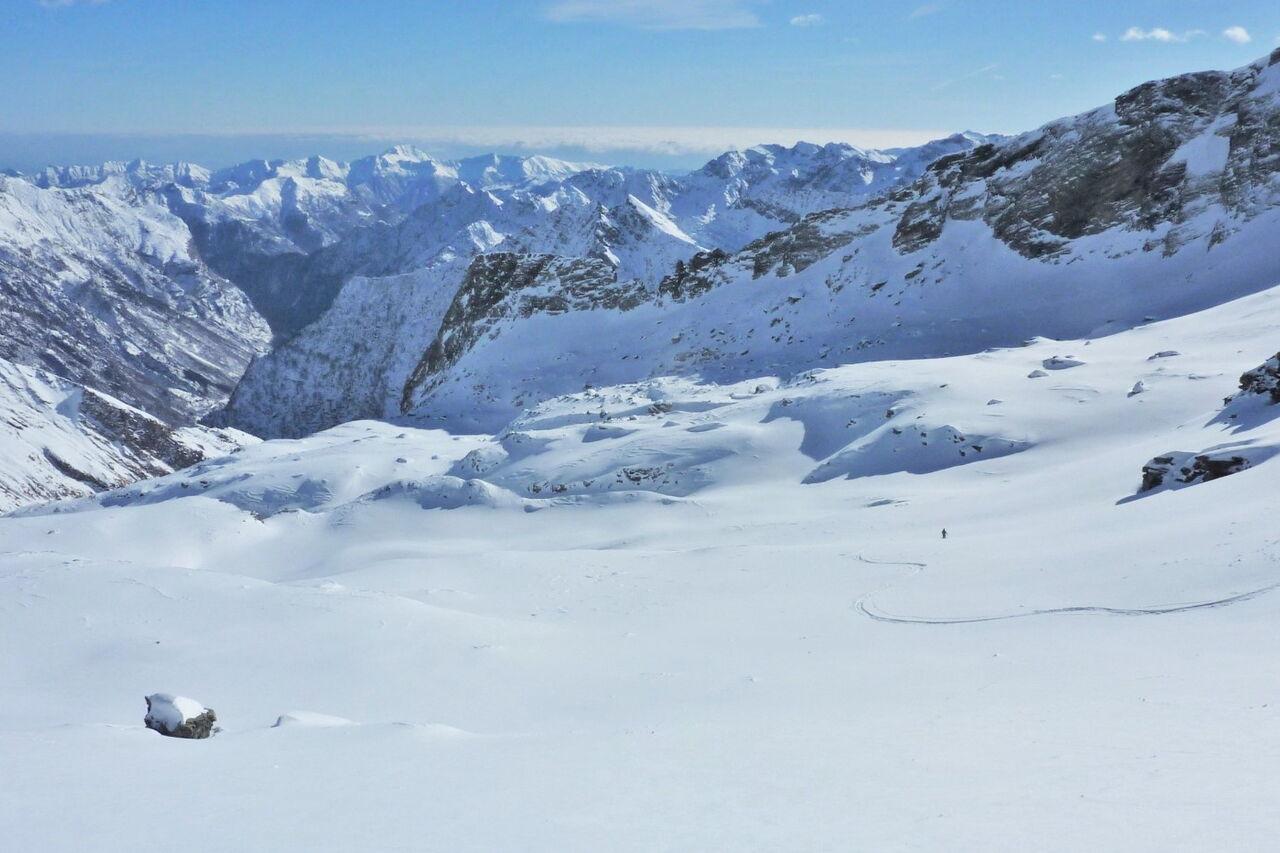 Der Einstieg zum Aufstieg ist nicht leicht zu finden. Sonst ist mithilfe des GPS-Tracks auf der Abfahrt die Orientierung einfach. Die Abfahrt führt über einen Südosthang. Folgende Ausrüstung wird empfohlen: Produkte für alpine Sicherheit im Schnee, Freerideski und Skitourenhelm. Es gibt keine Einkehr auf der Tour. Außer man nimmt vor oder nach der Tour eine Stärkung in dem Rifugio Città di Vigevano. Beste Jahreszeit: Januar bis Mitte März. Uns erwarten kurze Stücke mit bis zu 35° Hangneigung.