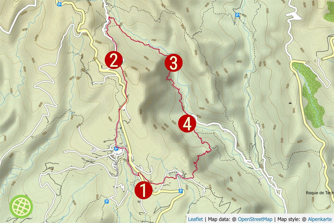 Am (01) Start und Ziel Alajeró (789 m) gehen wir ca. 40 m auf der Straße Richtung San Sebastián, um noch vor dem Restaurant El Mesón de Clemente, vor einem Zebrastreifen, links in die schmale Gasse - Weg mit dem Geländer - einzubiegen und zwischen den Häusern hindurchzugehen. Bei einer großen Steinplatte gehen wir links bis zur GM-3 vor und bleiben anschließend ein kurzes Stück auf dieser, um dann rechts den Wanderweg zur tiefer gelegenen Nebenstraße zu nehmen und dort rechts dem Verlauf der Straße 600 m folgen. In einer scharfen Linkskurve der Straße gehen wir halb rechts an einem braunen Garagentor vorbei und erreichen den zentralen Hauptplatz von Alajeró. Mittig zwischen den Häusern, in nördliche Richtung, beginnt der Weg Richtung Imada. Wir erreichen abermals die GM-3 und gehen auf der Asphaltstraße ortsauswärts an der Busstation vorbei. Die Straße macht eine Linkskehre und 20 m hinter einer Ruine verlässt der Camino nach rechts die GM-3.