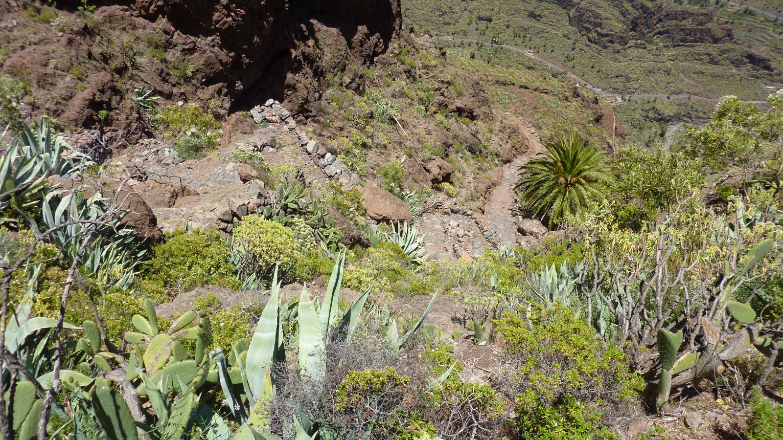 Direkt hinter der Kirche verlässt ein Camino nach rechts die Ortschaft. Wir folgen diesem Weg, bis sich das Tal stark verengt und wir oberhalb des (03) Barranco de Guarimiar (585 m) wandern. Mit gigantischen Tiefblicken führt der Weg in steilen Kehren und über ein mit Geländer gesichertes Erosionsband talwärts. Angesichts dieser Schönheit bleibt nur zu sagen: Dort innehalten, wo die Natur verzaubert.