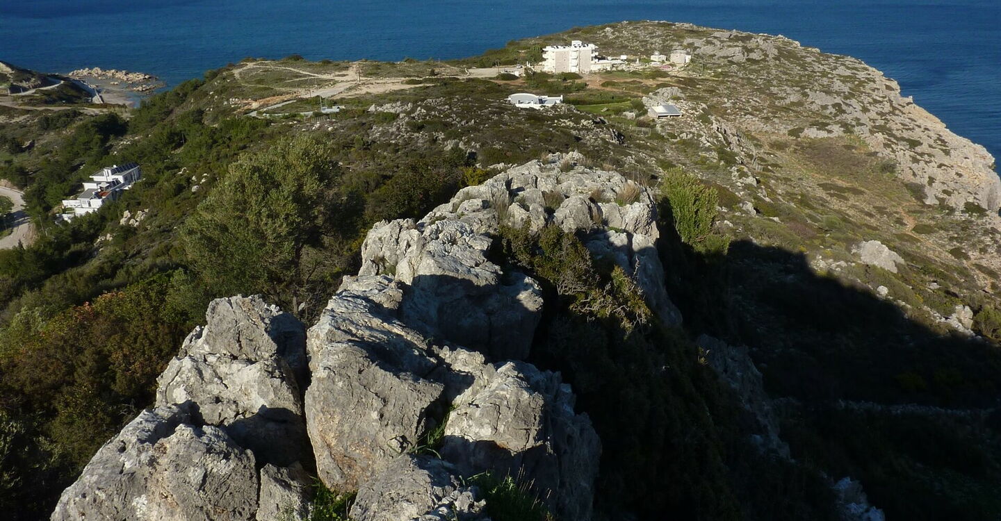 Entlang eines Maschendrahtzauns und über eine Ebene erreichen wir schon bald die (03) Hipparchos Apartments (130 m). Nach einem kurzen Stück parallel zur Zufahrtsstraße der Apartments gehen wir bei der folgenden Weggabelung links in Richtung der alleinstehenden Villa, um dort bei den Oleanderbüschen zunächst rechts auf einem Pfad parallel zum Maschendrahtzaun aufzusteigen. Der folgende kurze, aber knackige Aufstieg hat es in sich. Der Pfad verliert sich, auf dem weglosen Stück orientieren wir uns in Richtung der vor uns liegenden Felsnase. Nach einer Ebene wird das Buschwerk so dicht, dass wir uns rechts der Felsnase halten müssen, bis wir schlussendlich nach 50-60 m einen Pfad finden, der direkt auf den felsigen Grat zuführt. Wir steigen nun in luftiger Höhe direkt auf dem Grat hinauf, bis wir den Gipfel erreicht haben.