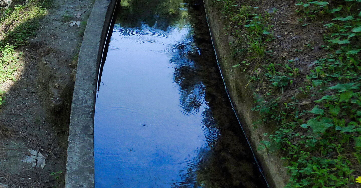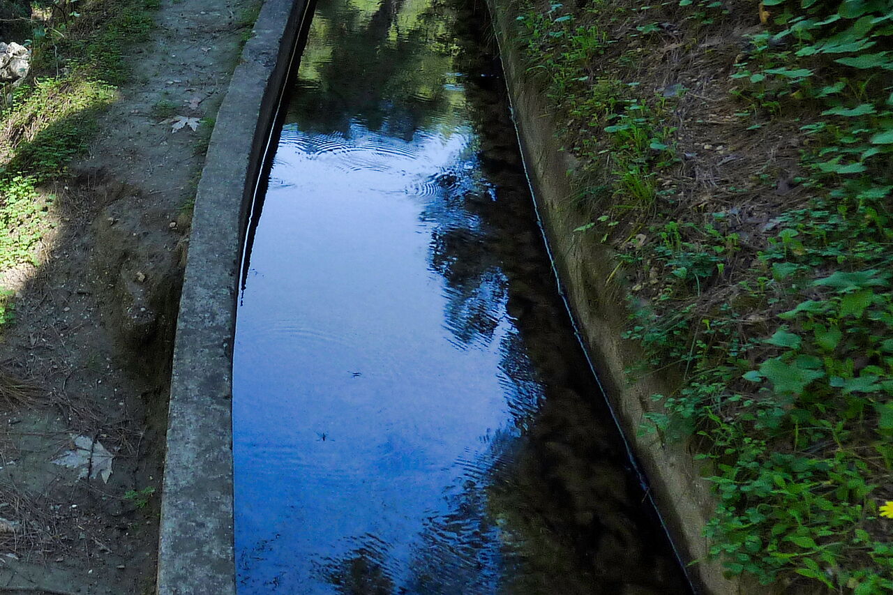 Dieser Weg führt leicht bergab in eine Senke. Bei der nachfolgenden Weggabelung gehen wir links herunter in den Wald. Vorbei geht es an einer offenen (02) Wasserleitung (94 m), bis wir 160 m links auf der Verbindungsstraße von Eleousa nach Kolymbia gehen. Hier, am Ende einer Betonmauer, steigen wir in das schmale Bachbett herunter und gehen rechts oder links, nun talaufwärts. Aufgrund von heftigen Niederschlägen verändert sich der Verlauf des Pfades ständig. Kurz vor einem Wasserfall steigen wir links die Böschung hoch, gelangen nun abermals an die offene Wasserleitung und gehen oberhalb des Bachlaufes direkt auf einen wunderschönen Wasserfall zu.