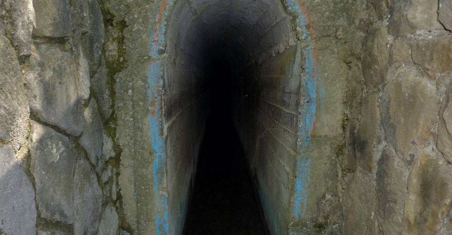 Nach 100 m treffen wir auf den Eingang zu einem 170 m langen, 40-50 cm breiten und nur 1,70 m hohen Tunnel, durch den man hindurch nur barfuß laufen kann. Auch sollte man vorher in den Tunnel hineinhören, ob sich bereits Personen in ihm befinden, denn nur in der Mitte des Tunnels gibt es die Möglichkeit, aneinander vorbeizukommen. Natürlich kann man auch durch das selbst im Hochsommer angenehm kühle Tal mit seiner üppigen Vegetation zum anderen Ende des (04) Tunnels (88 m) wandern.