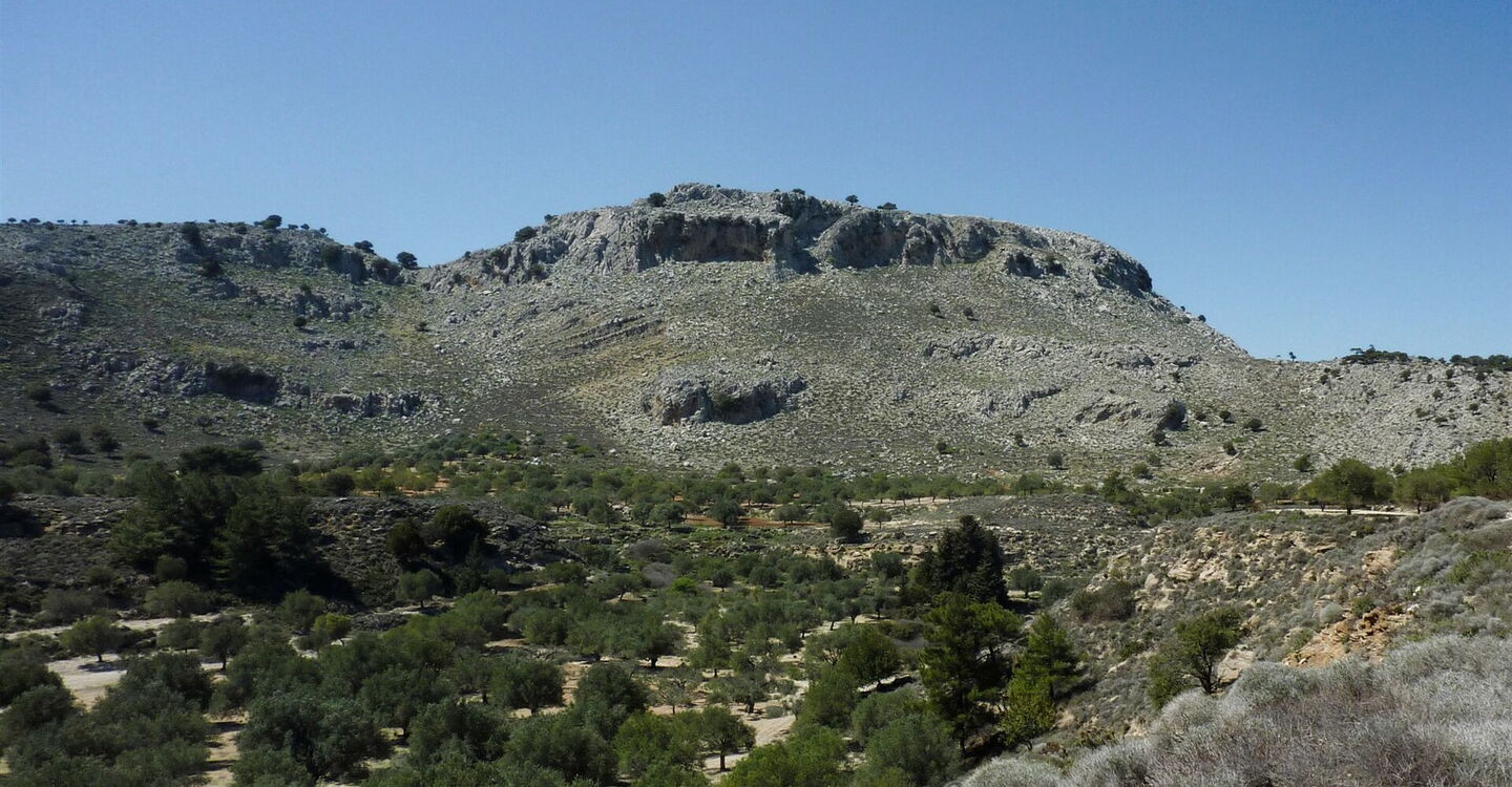 Vom (01) Start und Ziel (172 m) oberhalb von Archangelos laufen wir auf der Hauptstraße 500 m Richtung Rhodos Stadt und biegen unterhalb der Kirche links ab. Leicht bergan geht es auf der Asphaltstraße. Wir sind jetzt gut 900 m gegangen, haben die letzten Häuser hinter uns gelassen und treffen auf einen kleinen Betonpfeiler, der am Wegesrand steht. Hier gehen wir halb links auf die leicht bergab führende Schotterpiste. Bei der folgenden Weggabelung gehen wir halb links und nicht halb rechts bergauf. Im weiteren Verlauf ignorieren wir alle Abzweiger, bis wir auf ein alleinstehendes Haus treffen. Der Hauptweg läuft rechts um das Haus herum, während wir geradeaus an einer Ruine vorbeigehen – der Weg ist kurzfristig etwas schwerer auszumachen.
