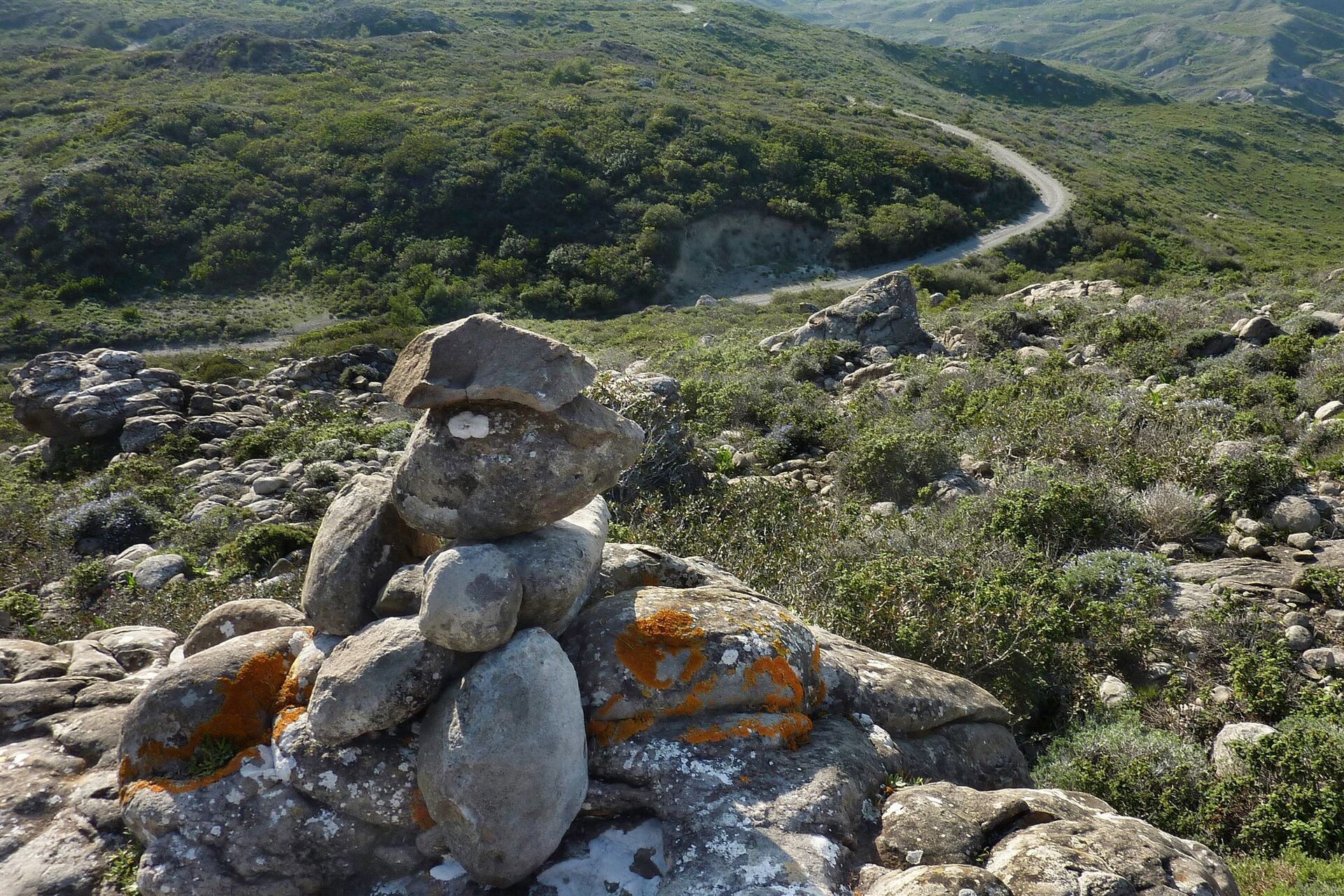 Vom Gipfel gehen wir weiter Richtung Windräder zu einer Einsattelung herunter und im weiteren Verlauf überschreiten wir weitere 3 Hügel. In der dann folgenden Senke befindet sich das erste Steinmännchen. Hier quert halb rechts ein Ziegenpfad den Hang. An dieser Stelle beginnt der (04) Abstieg (447 m). Im weiteren Verlauf treffen wir auf weitere Steinmännchen, bis wir bei einem gut sichtbaren Steinmännchen den Bergrücken überqueren. Unterhalb sehen wir schon die Schotterpiste. Hinter dem Bergrücken gehen wir zunächst links, um nach 20 m rechts zu einem Steinmännchen zu queren und nun durch den steilen, mit Buschwerk durchsetzten Hang bis zur Piste abzusteigen.
