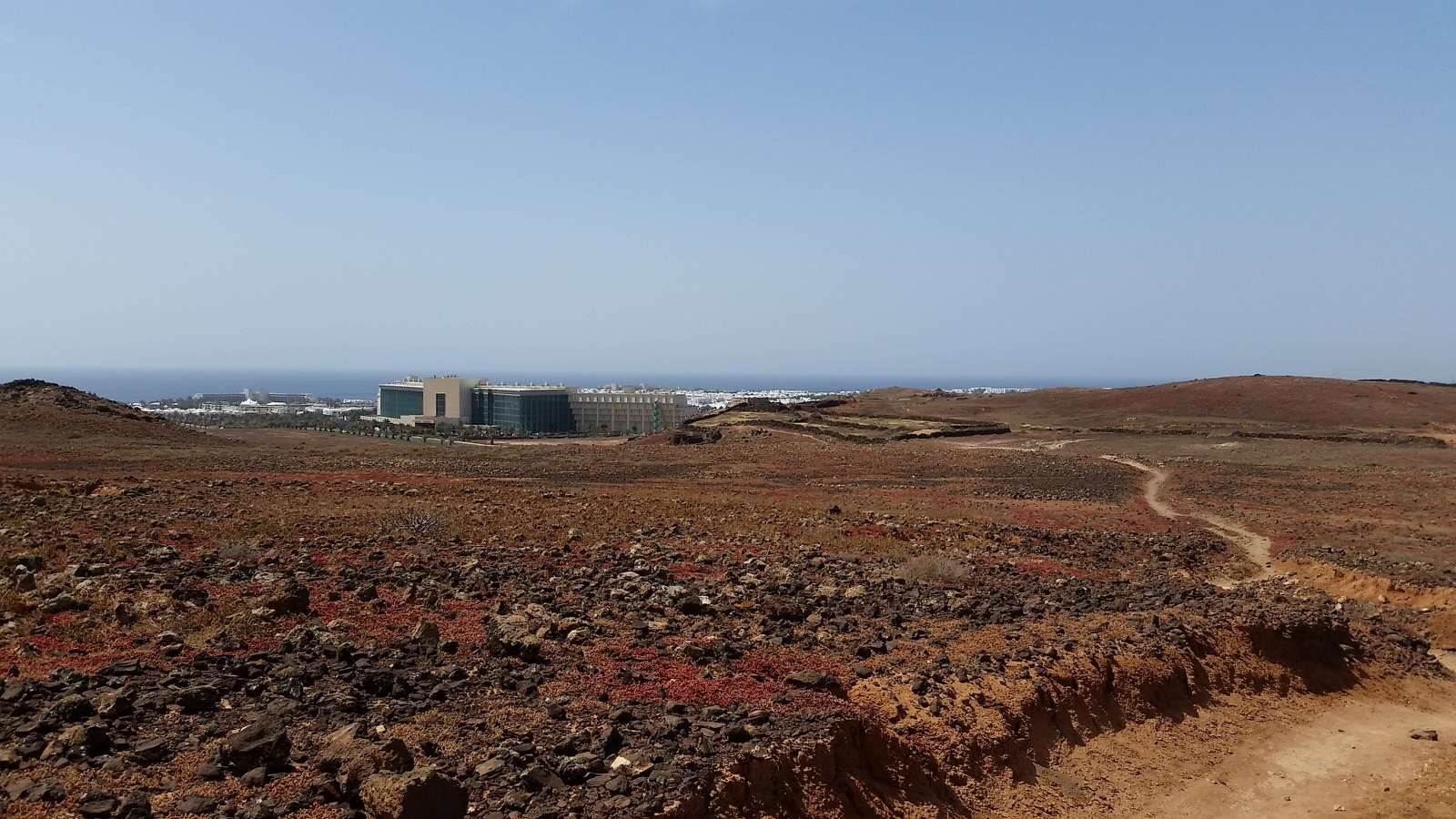 Nach 200 m, bei dem Abzweiger von der Hauptstraße nach rechts, überqueren wir die Straße nach links, passieren die hohe Mauer bei einem Durchlass und beginnen mit dem Aufstieg zum Gipfel der (03) Montaña Corona (225 m). Bei guter Sicht ergeben sich trotz der vergleichsweise geringen Höhe überraschende Fernblicke: So kann man entlang der Ostküste bis nach Arrecife blicken - gut zu erkennen am einzigen Hochhaus der Insel - und bei sehr guter Fernsicht kann man sogar die hell leuchtenden Dünen von Fuerteventura ausmachen. Richtung Norden erstreckt sich das Risco-de-Famara-Gebirgsmassiv (halb rechts), wir sehen die Burganlage von Santa Barbara oberhalb von TEGUISE und weiter links (Richtung Westen) lassen sich die Vulkane Montaña Tamia (550 m) und die Montaña Blanca (595 m) gut ausmachen.