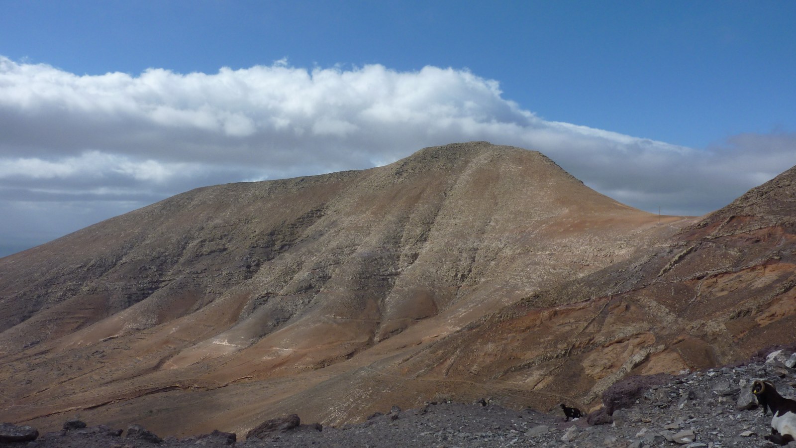 Danach geht es in Kehren 2 km und 200 Höhenmeter bergauf bis zur Einsattelung (05) Degollada de Portugués (431 m). Links, etwas unterhalb unseres Standorts, liegt eine weitere Ziegenhaltung. Von dort führt eine Schotterstraße zur LZ-702, in die El-Ruicón-Ebene. Rechts von uns befindet sich ein Abzweiger auf den Pico Redondo. Wir gehen aber auf dem eingeschlagenen Weg weiter - dabei macht der Weg eine leichte Rechtskurve um eine Kuppe herum -, bis wir nach 100 m auf einen Pfad treffen. An dieser Stelle wandern wir weiter rechts und gehen nun Richtung Norden durch die Westflanke des Pico Redondo. An den Stellen, wo der Weg angelegt wurde, schimmert hellbraunes Gestein hindurch. Als Orientierungshilfe können wir eine Wasserleitung nutzen, die auf dem ersten Teilstück parallel zum Weg verläuft. Im Verlauf gehen wir unter zwei Strommasten hindurch und erreichen bald die Ziegenhaltung, die wir bereits vom Hinweg kennen. Von hier aus gehen wir das letzte Teilstück bis nach Femès herunter.