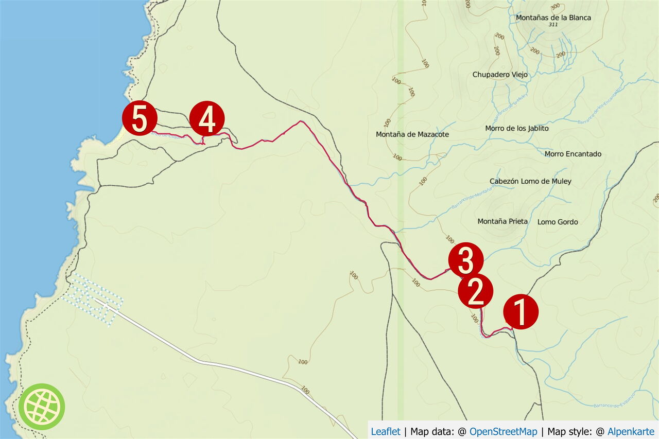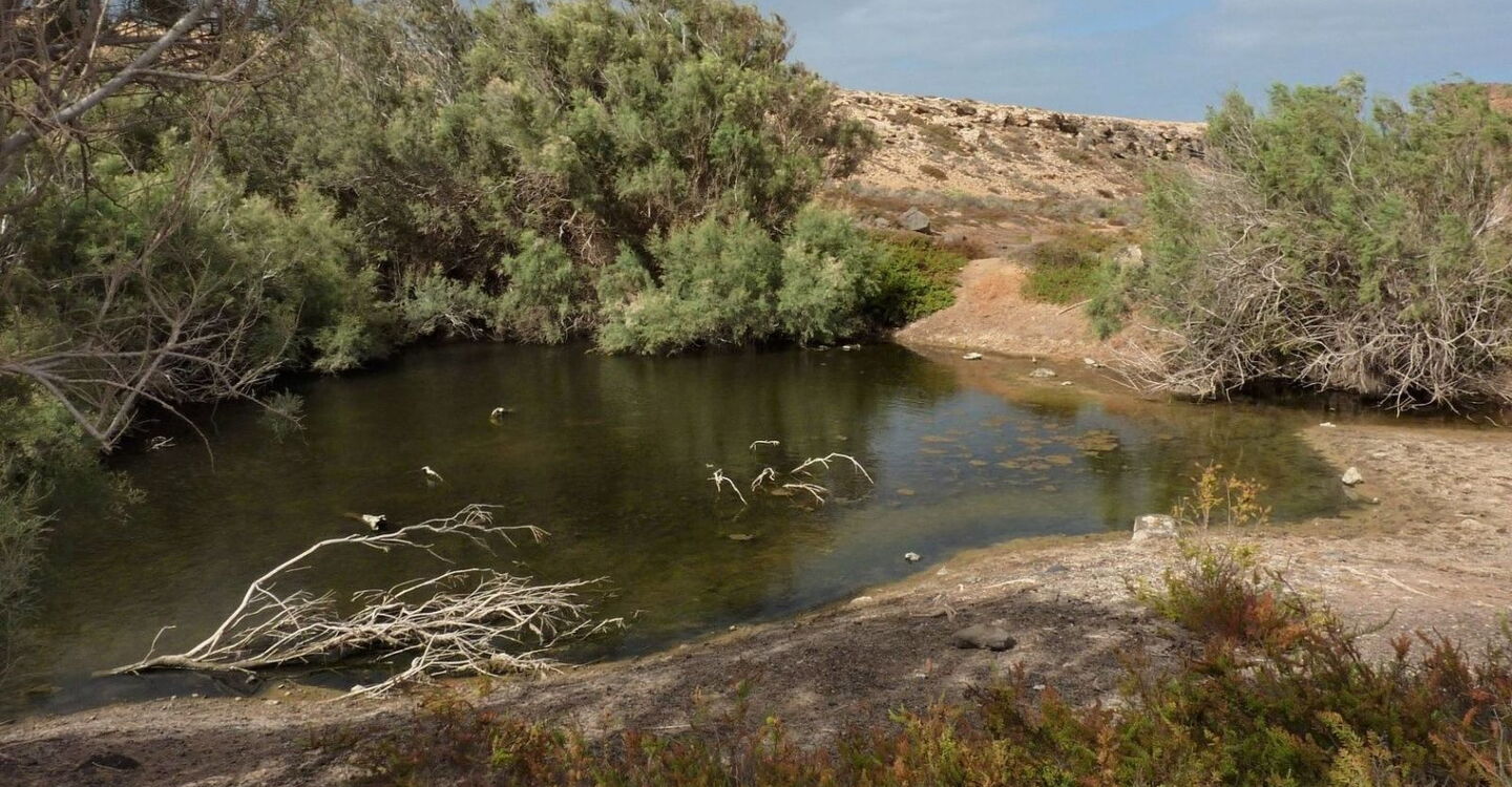 Am (01) Start und Ziel (113 m) steigen wir in das Barranco ein und beginnen unsere Wanderung in westliche Richtung. Durch eine lang gezogene Rechtskurve folgen wird dem Verlauf des Trockenflussbettes.