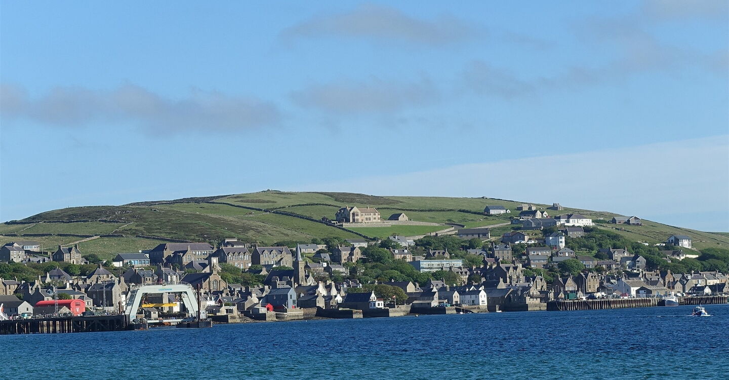 Die Schotterpiste weicht einer Asphaltstraße. Abzweiger nach rechts und links werden ignoriert. Wir folgen dem Straßenverlauf durch die Rechtskehre und die Linkskehre und gehen geradeaus durch den ersten Kreisverkehr, sodass wir nun 05 Stromness (30 m) erreicht haben. Nach 50 m folgen wir nicht der Hauptstraße durch die Rechtskehre, sondern gehen hier geradeaus. Nach abermals 50 m, bei den großen weißen Säulen, biegen wir links in die Franklin Road ab. Diese verlassen wir auf einem halb rechts abzweigenden Fußgängerweg, der kurz später endet. Wir gehen nur noch einige Meter rechts herunter und erreichen den Dorfkern von Stromness. Durch die alten Gassen gehen wir links zurück bis zum Busbahnhof oder Parkplatz.