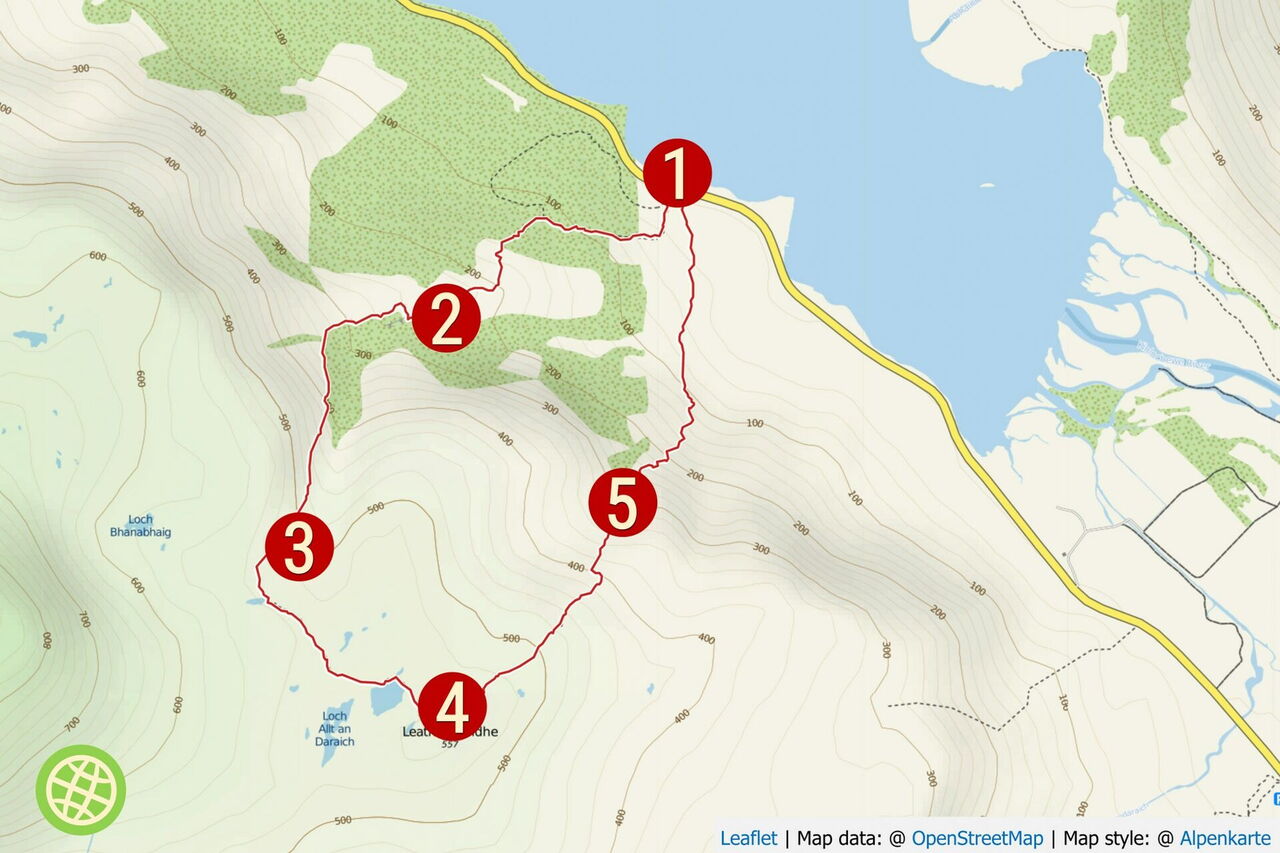 Einfache Wanderung für die ganze Familie. Die größte Herausforderung sind die Höhenmeter und ein etwas steileres Stück beim Abstieg. Art des Weges: 100 % Pfad. Zusatzausrüstung: Keine. Einkehr: Keine auf der Wanderung. Beste Wanderzeit: Ganzjährig. Empfehlung: Man kann eine Broschüre mit der Erläuterung aller Wegpunkte dieser Wanderung herunterladen: https://www.nature.scot/sites/default/files/2018-02/Beinn%20Eighe%20Mountain%20Trail%20Leaflet.pdf.