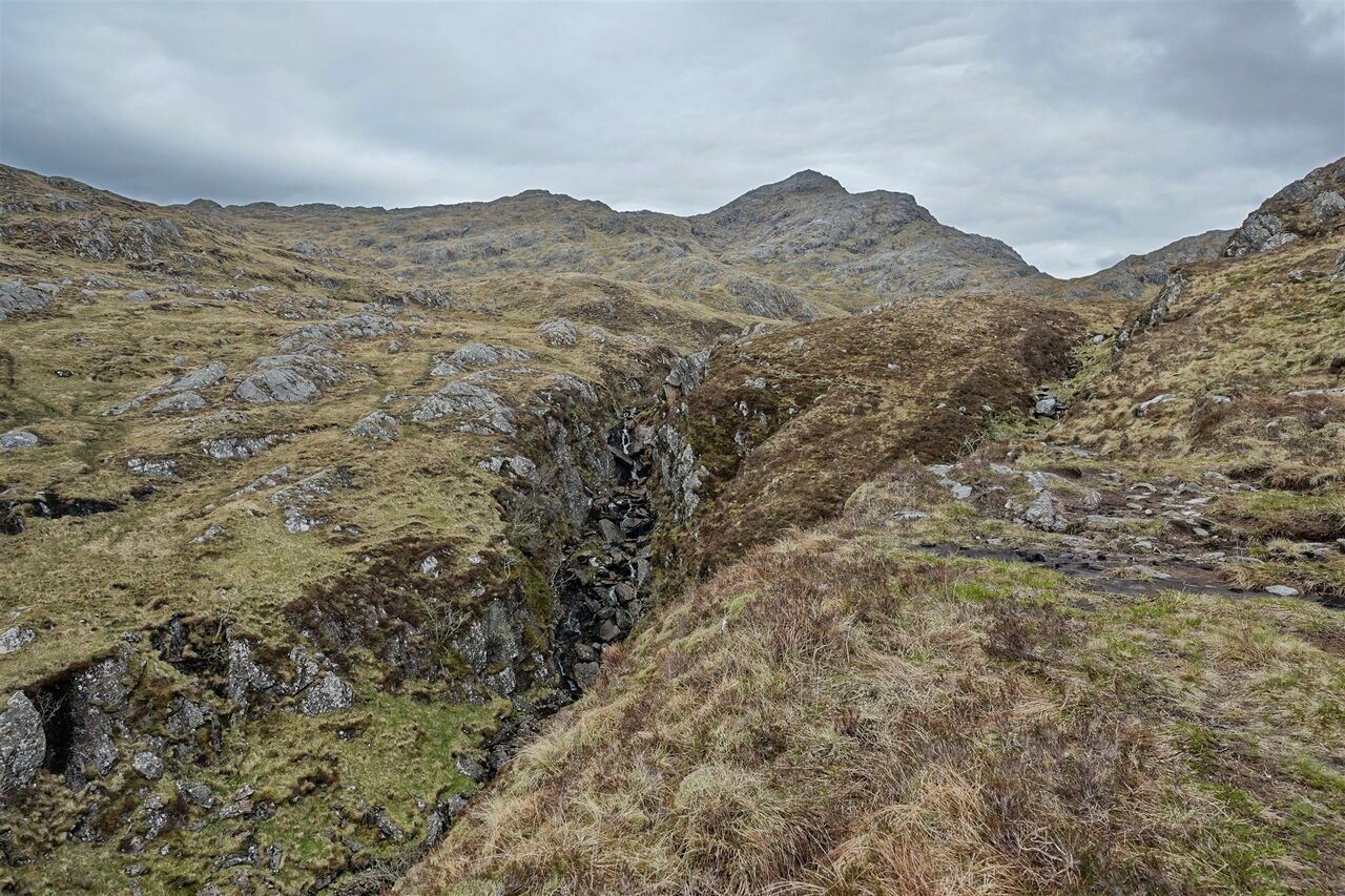 Wir laufen in einer kleinen Schlucht an einem Bachlauf entlang. Es ist kaum noch ein Pfad auszumachen. Als Orientierungshilfe kann man entlang des Bachlaufes gehen und bei guter Sicht hat man den Gipfel sowieso immer vor Augen. Wir erreichen schließlich 03 steileres Gelände (435 m).