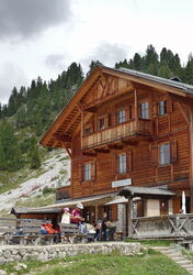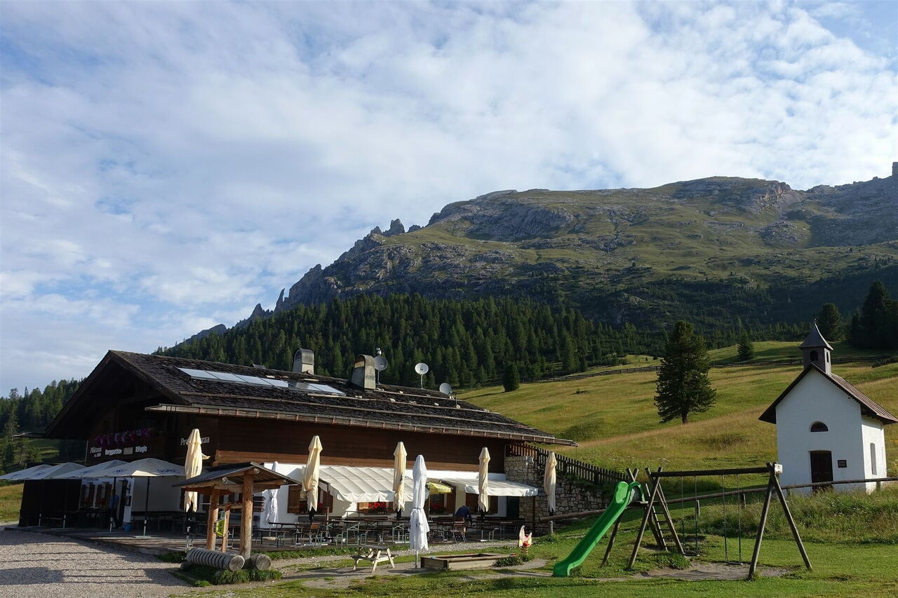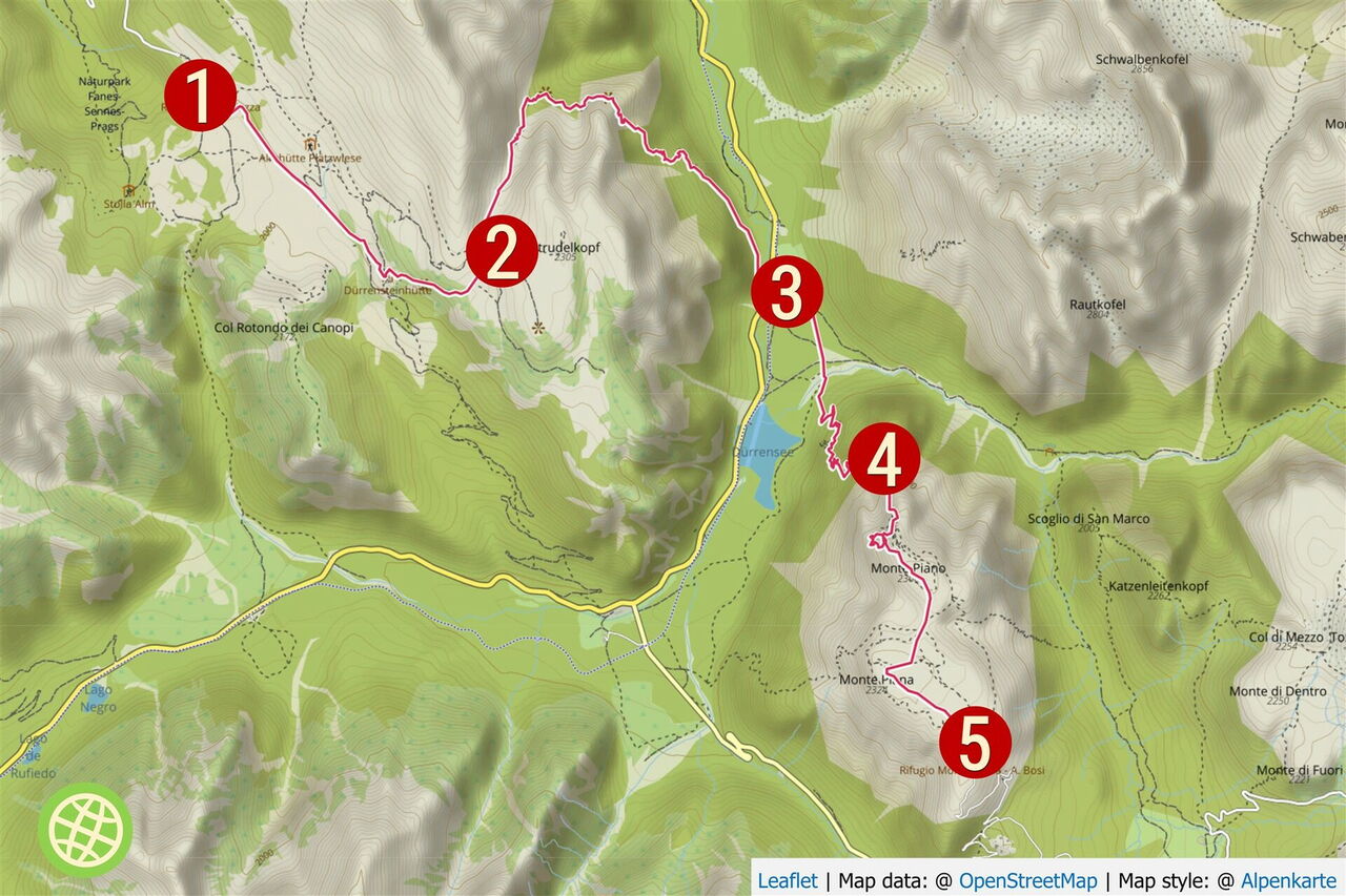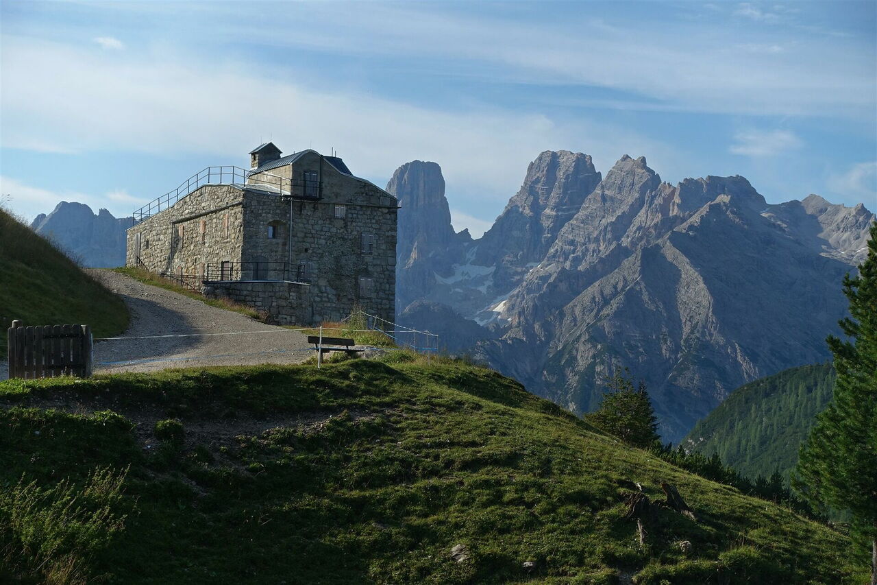 Auf dem Wanderweg 37 gehen wir vom 01 Berggasthof Plätzwiese (2.000 m) in südöstlicher Richtung am Berghotel Hohe Gaisl vorbei. Den linken bergauf führenden Abzweiger zur Almhütte Plätzwiese – hier gibt es keine Übernachtungsmöglichkeiten – lassen wir aus. Hinter einer Brücke gehen wir an der Weggabelung halb links bergauf. Vor uns liegt das 1888–1895 gebaute Fort Prato Piazza (Sperrwerk Plätzwiese), es gehörte zu den österreichischen Befestigungsanlagen an der italienischen Grenze.