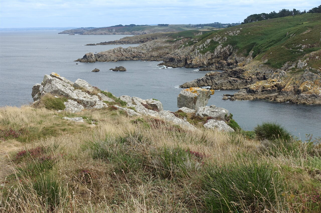 Auf dem Zöllnerpfad geht es weiter Richtung Osten. Mehrere Bachläufe werden überquert, bevor wir die traumhaft versteckte Bucht am 04 Plage de Trénaouret (32 m) entdecken, sie liegt kurz vor der nachfolgenden Landzunge Pointe de Trénaouret. Hinter den Überresten von Steinmauern haben wir eine weitere Landzunge umlaufen und blicken nun in das weite Rund einer Bucht, auch einen goldgelb strahlenden Sandstrand können wir ausmachen. Nach einem kurzen Abstieg zu einer Slipanlage erfolgt ein Aufstieg und wir gehen an dem links unterhalb liegenden Plage de Pors-Kiol vorbei.