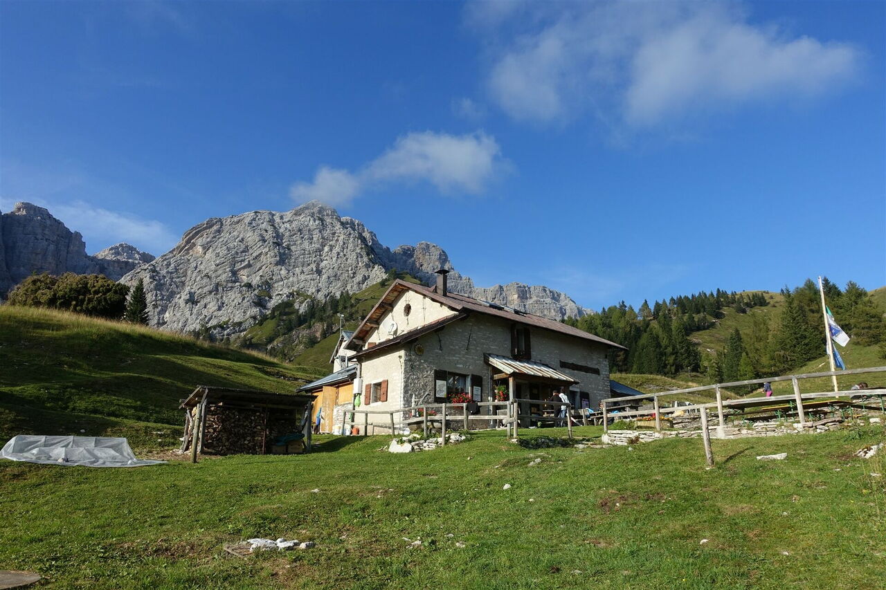 An dieser Wegekreuzung gehen wir geradeaus und erreichen nach einem kurzen Abstieg das idyllisch gelegene 05 Rifugio Bruno Boz (1.718 m).