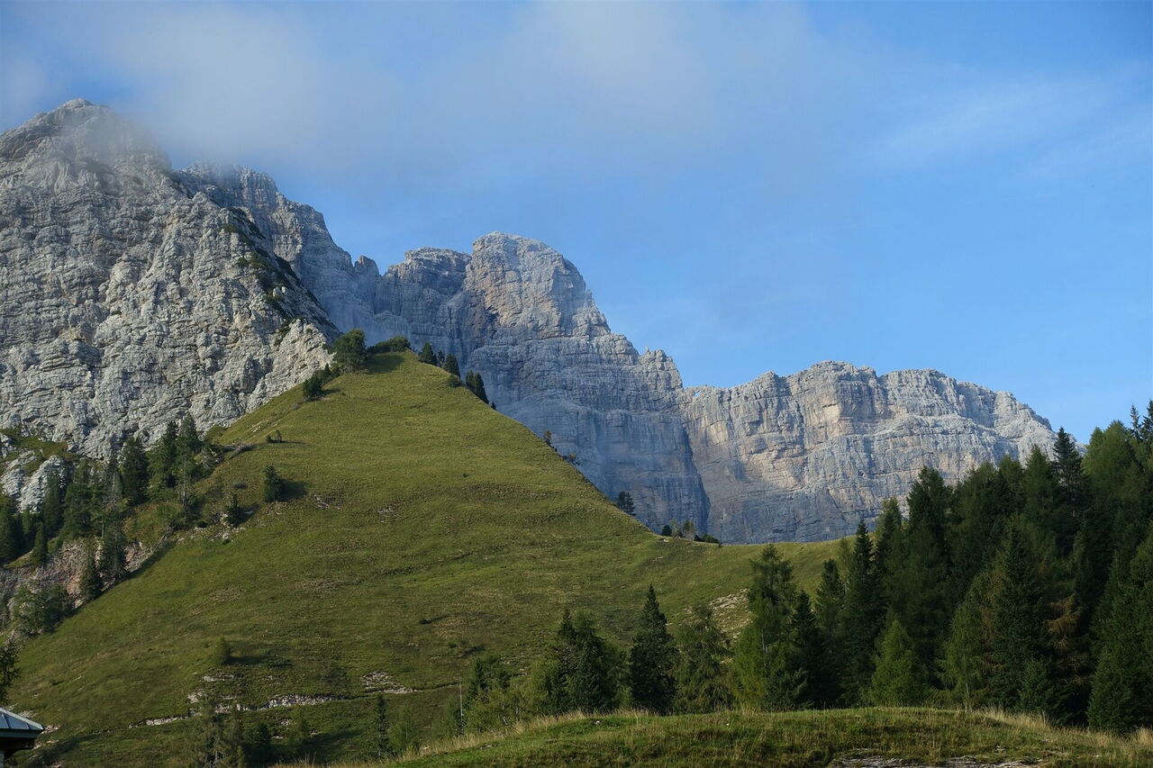 Vom 01 Bivacco Feltre (1.930 m) folgen wir dem ausgeschilderten Wanderweg 8 in südlicher Richtung zum Rifugio Bruno Boz. Der Pfad führt zunächst bergab und wir queren eine kleine Schlucht mit einem Wasserfall.