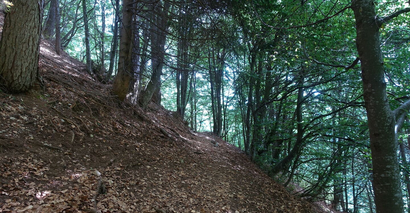 Nachdem wir die steilen und grasbewachsenen Berghänge hinter uns gelassen haben, gelangen wir in den 03 Bosco (Wald) (1.417 m). Im Wechsel zwischen grasbewachsenen Lichtungen und weiteren Waldstücken gehen wir nun kontinuierlich bergab, bis wir dann an einem Kreuz, einer Bank und einem Heiligenschrein vorbeikommen. Ca. 30 m hinter dem Heiligenschrein gehen wir rechts weiter, nun auf einem mit Steinen gesäumten Pfad – weiterhin der Wanderweg 482.