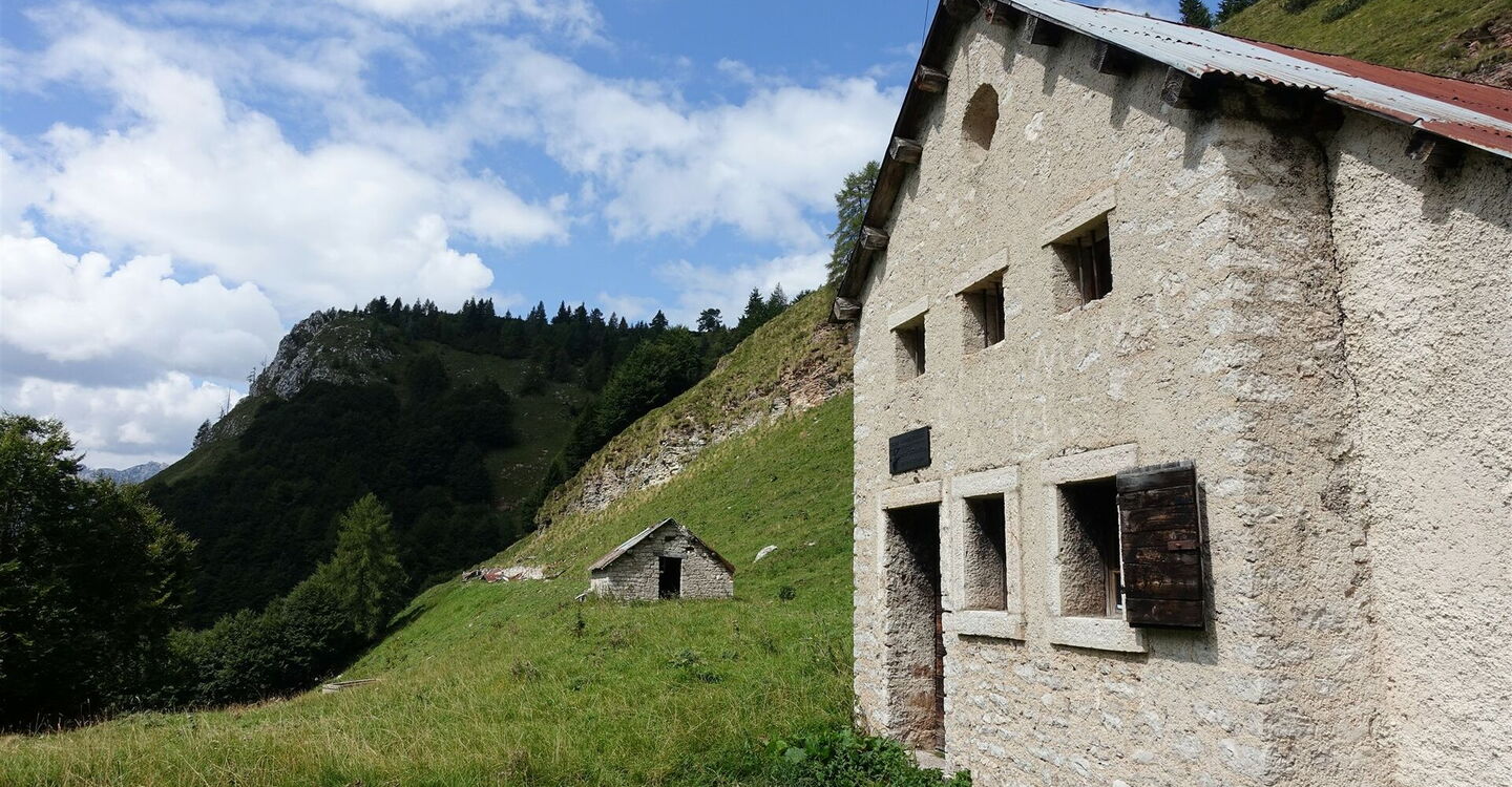 Vom 01 Bivacco Tovanella (1.688 m) folgen wir dem schlecht zu erkennenden weiterführenden Pfad. Es gibt zwar keine entsprechenden Hinweise, aber es handelt sich um den Wanderweg 482, auf dem man nur wenige rote Markierungen findet. Wir steigen nicht nach rechts in das Tal ab, sondern gehen leicht ansteigend in südwestliche Richtung, um unterhalb von Felsen auf einem nun gut zu erkennenden Pfad durch einen lichten Wald aufzusteigen.