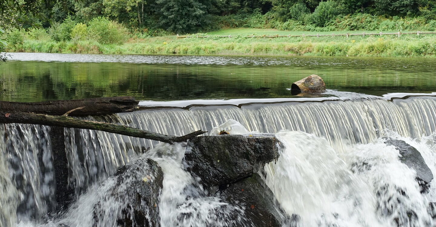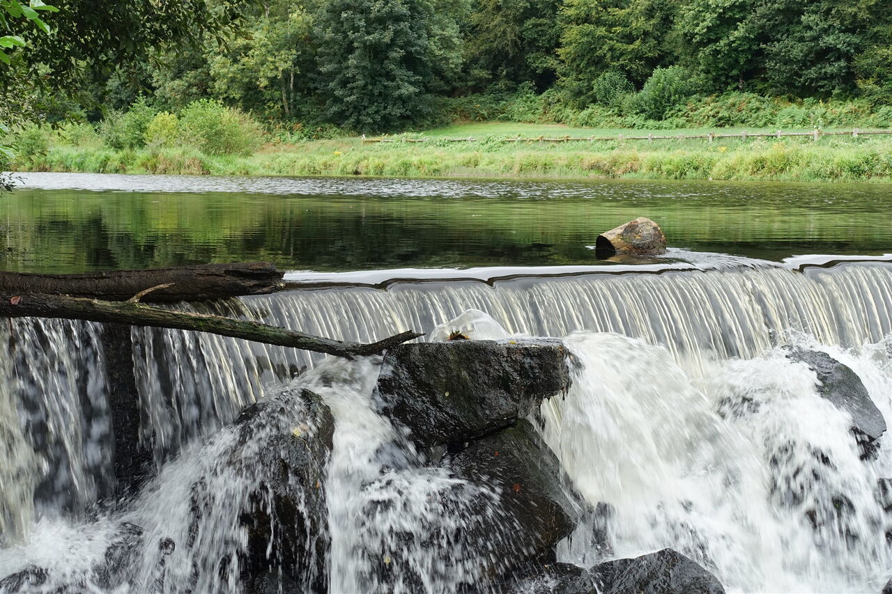 Ein langes Stück gehen wir nun an dem kanalisierten Fluss Blaver entlang. Der 1842 in Betrieb genommene Nantes-Brest-Kanal verbindet die Loire bei Nantes mit der Bucht bei Brest. Lange Zeit war er für die Bretagne eine wichtige Schifffahrtsverbindung, seit dem Bau des Staudamms Guerlédan ist er allerdings nicht mehr durchgängig befahrbar. Wir wandern bis zur Schleuse 02 Ecluse de Bellevue (130 m) und gehen fortan in entgegengesetzter Richtung am Kanal entlang. Bei einem Holzgatter verlassen wir den Kanal, gehen links bergauf und folgen der Ausschilderung Richtung Les Forges des Salles. Der Pfad mündet in einen breiteren Weg und wir gehen hier geradeaus weiter. Bei der darauffolgenden Weggabelung halten wir uns halb rechts.