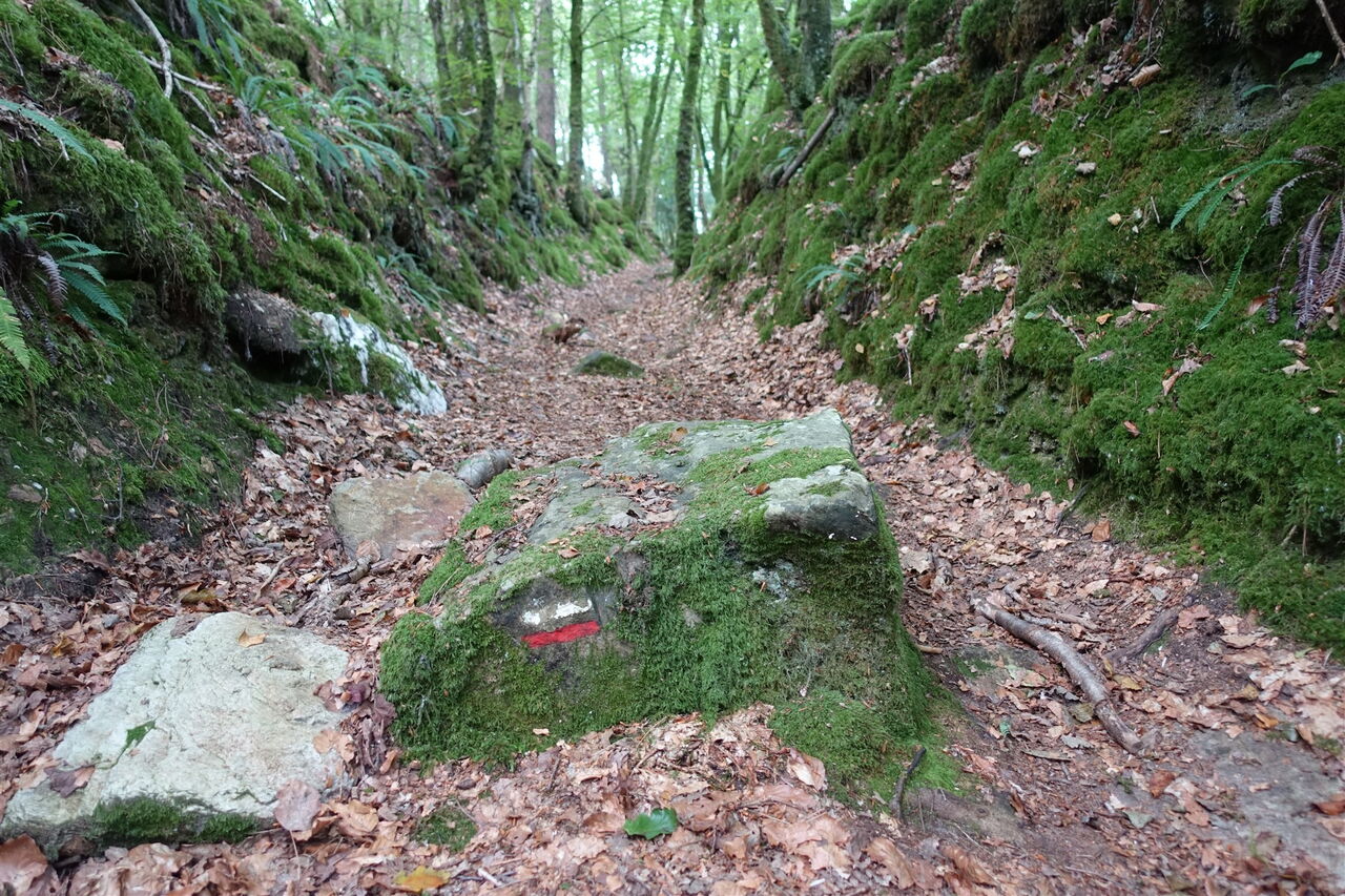 Auf einer Anhöhe zweigen zwei Wege nach rechts ab. Wir nehmen den halb rechten Weg und gehen nun durch den Wald 04 Bois Du Fao (199 m). Nachfolgend befinden sich weiße Markierungspfeile an den Bäumen, die eine gute Orientierungshilfe sind. An einer Wegekreuzung gehen wir geradeaus weiter, mehrere rechte und linke Abzweiger vom Hauptweg ignorieren wir. Bei einer Weggabelung verlassen wir dann den Wald nach halb rechts. Anschließend gehen wir auf einem schwer zu erkennenden Weg über eine Wiese. Orientierungshilfe: Wir gehen unter einer Stromleitung hindurch in Richtung eines erhöht liegenden Hauses. Dort befindet sich eine Straße, auf der wir links bis zu einer Straßenkreuzung mit einem Steinkreuz gehen.