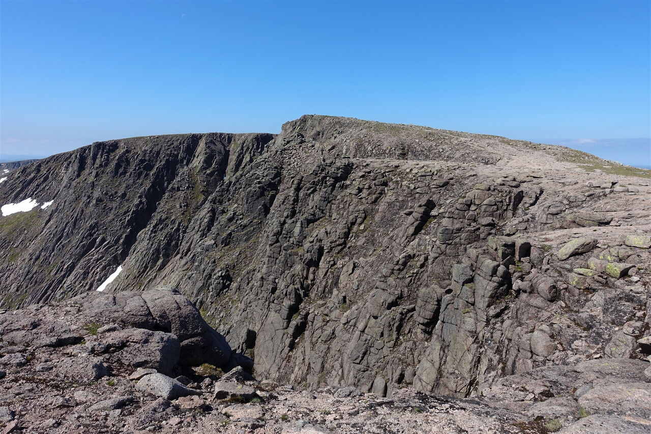 Nach 8,5 km allmählicher Annäherung beginnt nun endlich der richtige Aufstieg, der zunächst recht steil ist. Dabei ergeben sich wunderschöne Fernblicke in die Bergwelt der Cairngorms. Ein Pfad ist immer gut auszumachen und nach einem kurzen Abstieg erreicht man das flache Gipfelplateau des 03 Sron Na Lairige (1184 m). Es folgt ein kurzer Abstieg zu einer Einsattelung, um dann auf dem zunächst breiten Grat des Braeriach aufzusteigen.