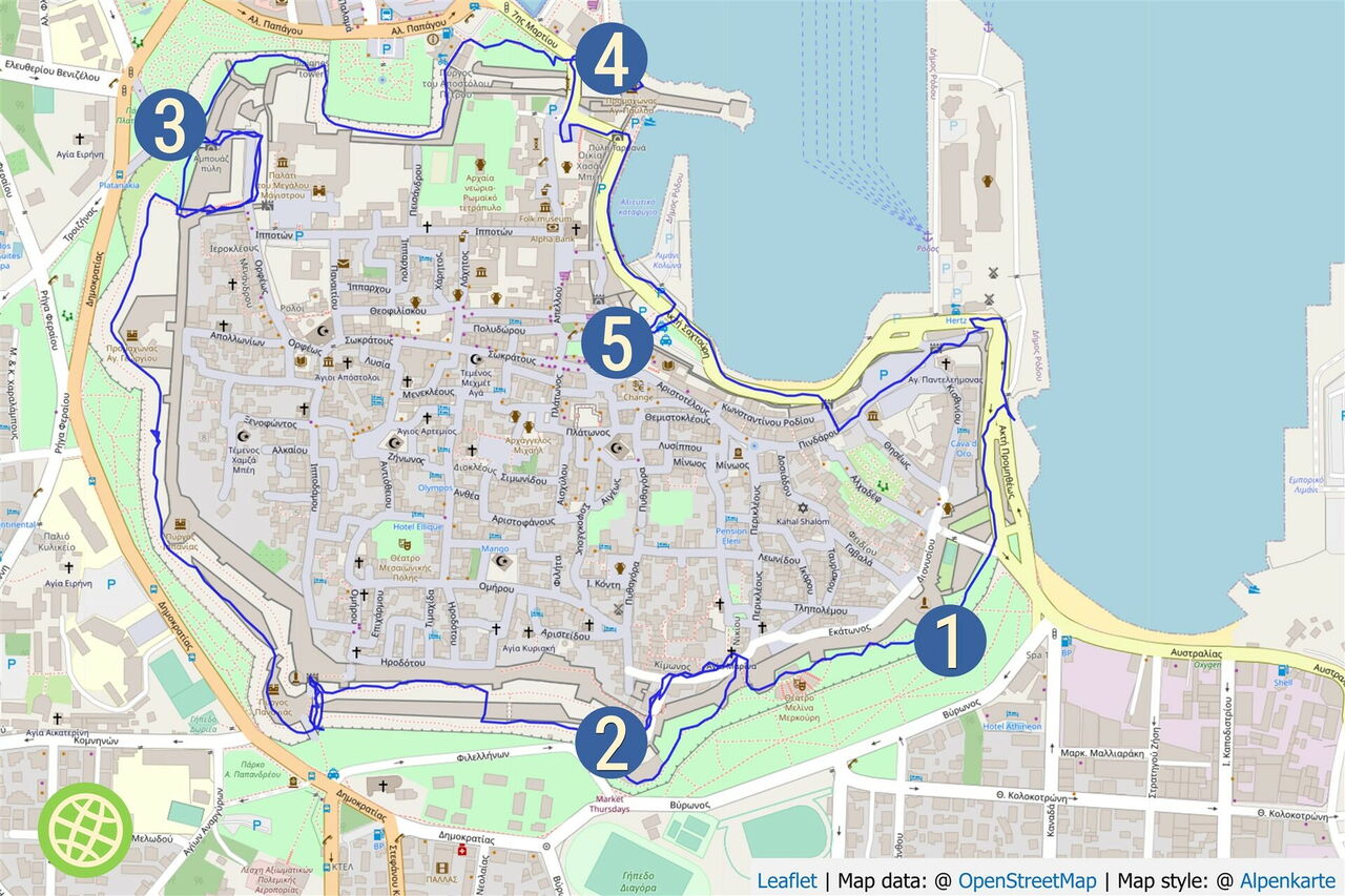 Wir erreichen das imposante (05) Marientor zum Hafen (1 m). Es besteht aus 2 mächtigen Rundtürmen, wurde 1487 vom Großmeister Pierre de' Aubusson verstärkt und erwies sich bereits 2 Jahre später bei einem Angriff der Osmanen als wehrhaft. Weiter führt uns der Weg bis zum nordöstlichen Rand der Altstadt mit dem St.-Katharina-Tor (Pili Agias Ekaternis), auch das Tor des Meeres (Thalassini Pili) oder Hafentor (Pili Limaniou) genannt. Wir erreichen den Fährhafen und schon kurz später unseren Parkplatz.