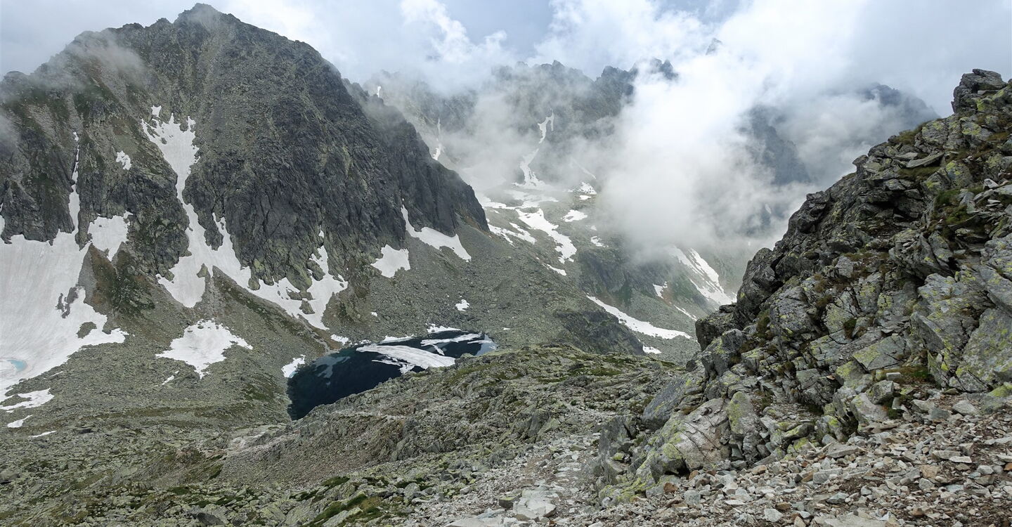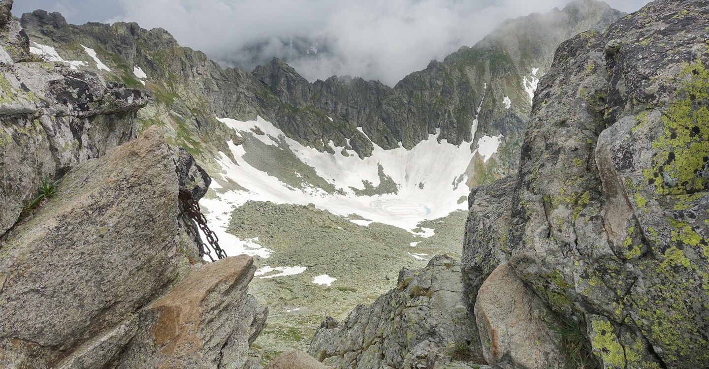 Der finale Aufstieg zur Einsattelung ist extrem steil, selbst im Juni befinden sich hier noch Restschneefelder, die gequert werden müssen. Da die Route jedoch oft begangen wird, ist meist eine ausgetretene Spur vorhanden und Steigeisen sind in der Regel nicht notwendig. Die letzten Meter bis zum 03 Bystrá lávka (2300 m) sind dann mit einer Kette gesichert. Durch eine Felsspalte schlüpft man auf die andere Seite des schmalen Grats. Sehr spektakulär! Bei guter Sicht schaut man direkt in die Gipfelregion des 2494 m hohen Berges Kriváň, dem Nationalsymbol der Slowakei. Siehe Wanderung 38.