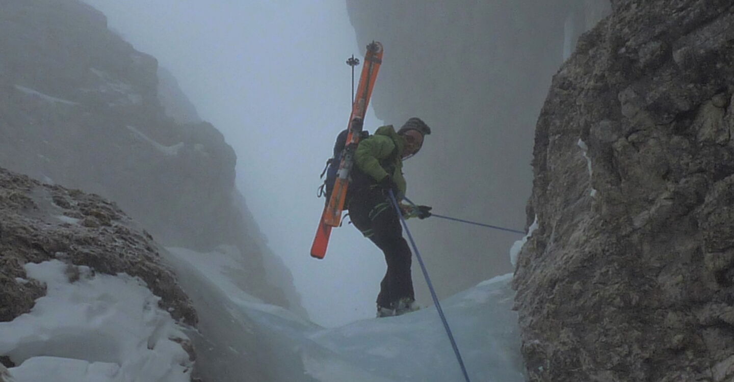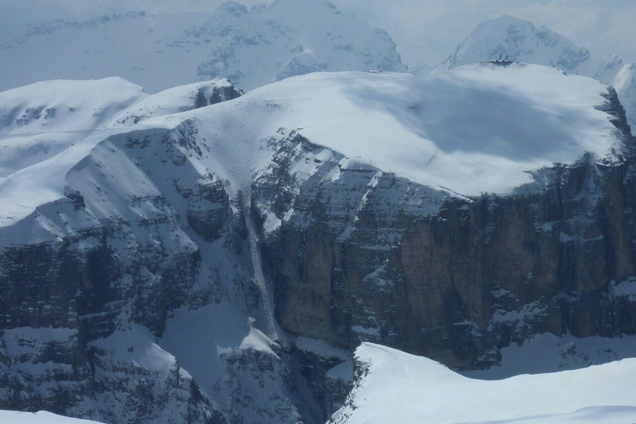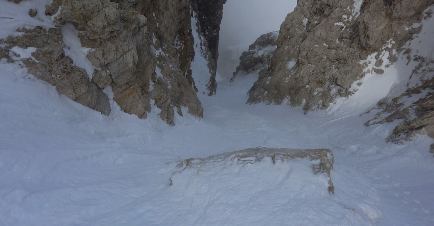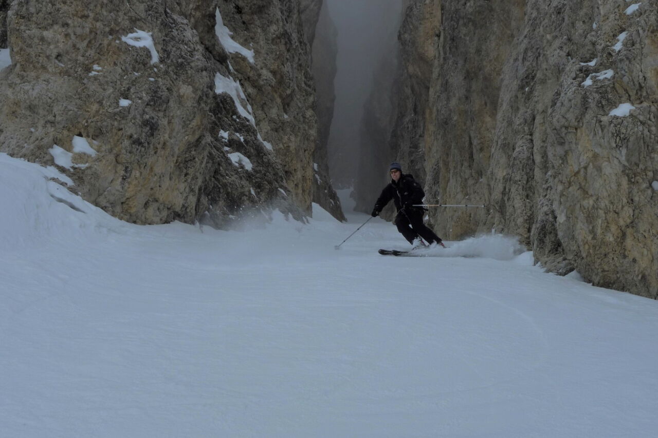 Mein GPS hat in der Scharte versagt. Aber einmal drin, gibt es keinen anderen Weg mehr als hinunter. Die Abfahrt führt über einen Nordhang. Folgende Ausrüstung wird empfohlen: Produkte für alpine Sicherheit im Schnee, Freerideski, Klettergurt mit 20m Kletterseil, Steigeisen und Pickel und Skitourenhelm. Es empfiehlt sich die Einkehr in das Rifugio Maria bei der Bergstation, welches nach Maria Piaz, der Pionierin des Tourismus am Pordoipass, benannt wurde. Beste Jahreszeit: Januar bis April. Uns erwarten kurze Stücke mit bis zu 50° Hangneigung.