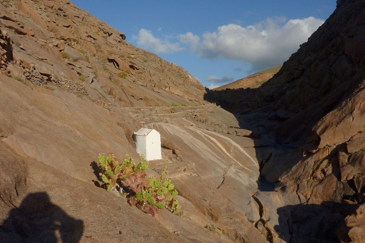 Nach einem weiteren Kilometer haben wir bereits links von uns liegende Terrassenfelder hinter uns gelassen. Das Barranco gabelt sich und ein Arm führt unter der Hauptstraße durch – wir folgen dem linken Flusslauf. Wir passieren Terrassenfelder und laufen auf dem Pfad durch das Barranco de Mal Paso direkt auf die imposant vor uns stehenden Basaltformationen zu. Bald erreichen wir eine Verzweigung, an der drei Barrancos zusammenfließen. Wir gehen dort einige Meter in das linke Barranco herein, um dann aus ihm herauszusteigen und auf dem mit Steinen gesäumten Weg in einer langen Rechtskehre die (05) Wallfahrtskirche (159 m) zu erreichen. Wir steigen noch bis zur Dammkrone auf und gehen dann links an einem der größten Tamariskenwälder Fuerteventuras vorbei, zunächst parallel zum Flusslauf, dann im Flusslauf, bis wir wieder zum Ausgangspunkt gelangen.